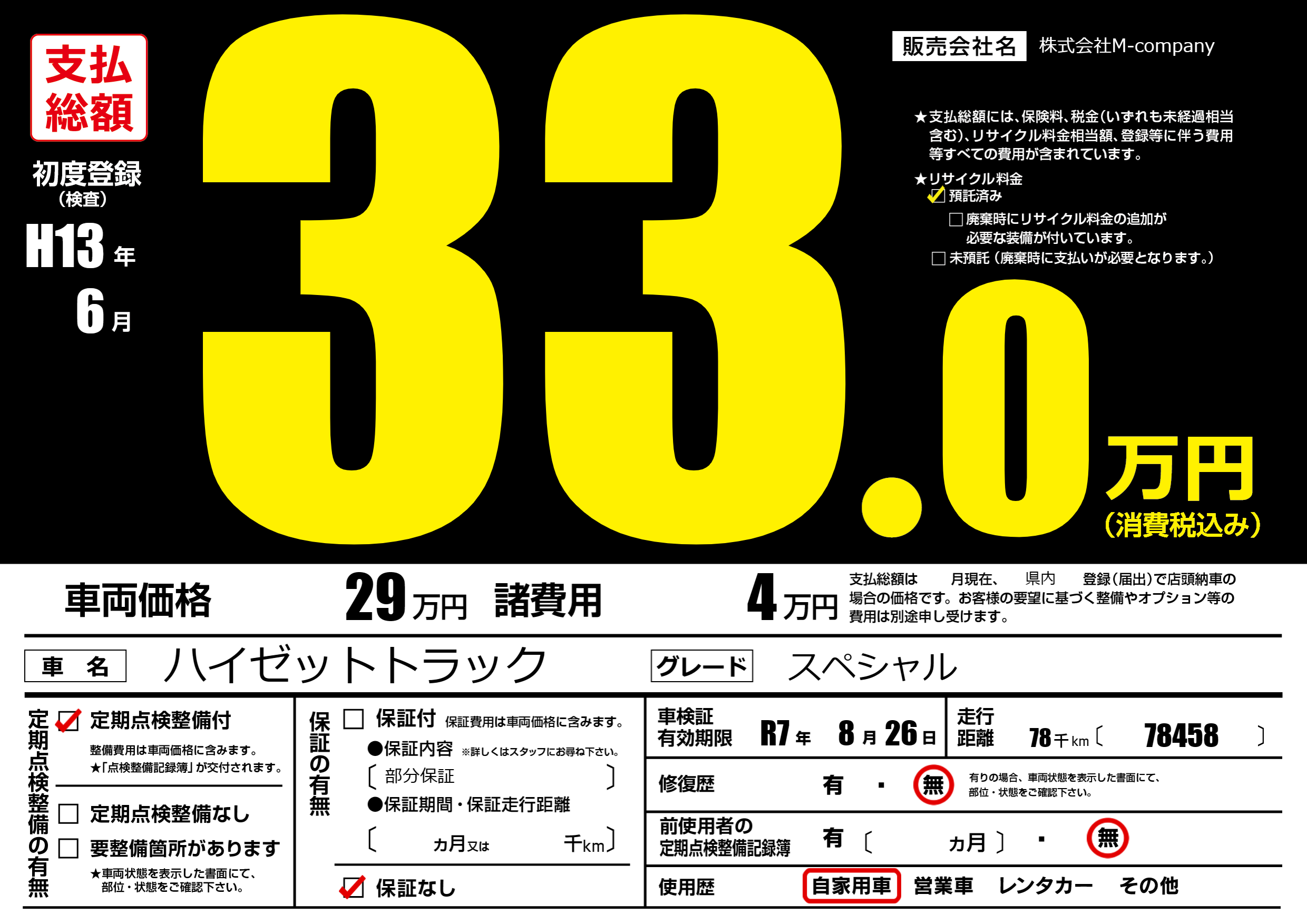 | 走行キロ | 7.8万km | 初年度登録 | H13年6月 |