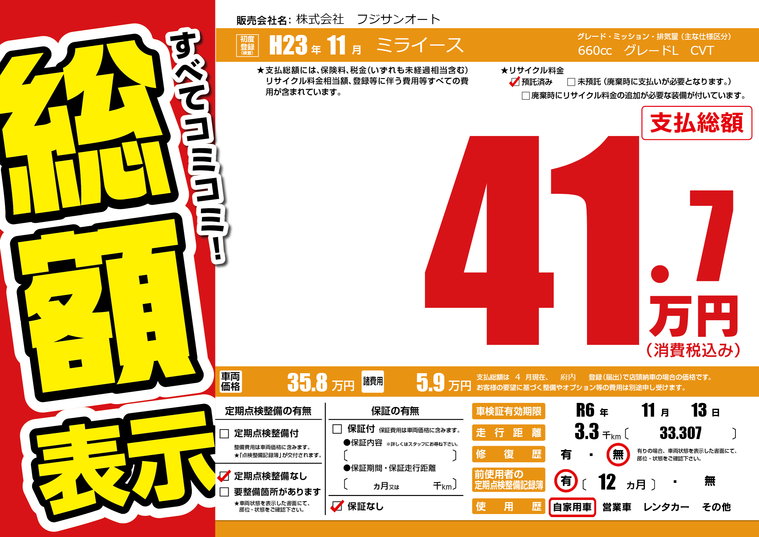 | 走行キロ | 0.3万km | 初年度登録 | H23年11月 |