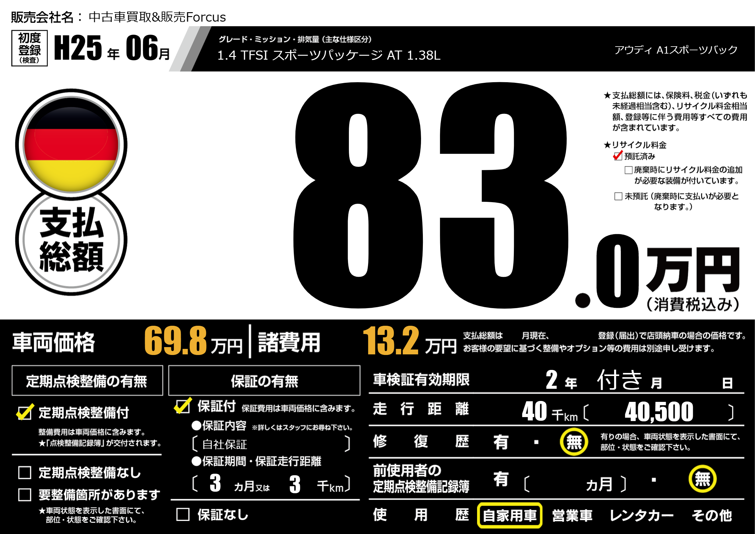 あり | リサイクル預託金相当額 | ( 0円)が別途必要 |