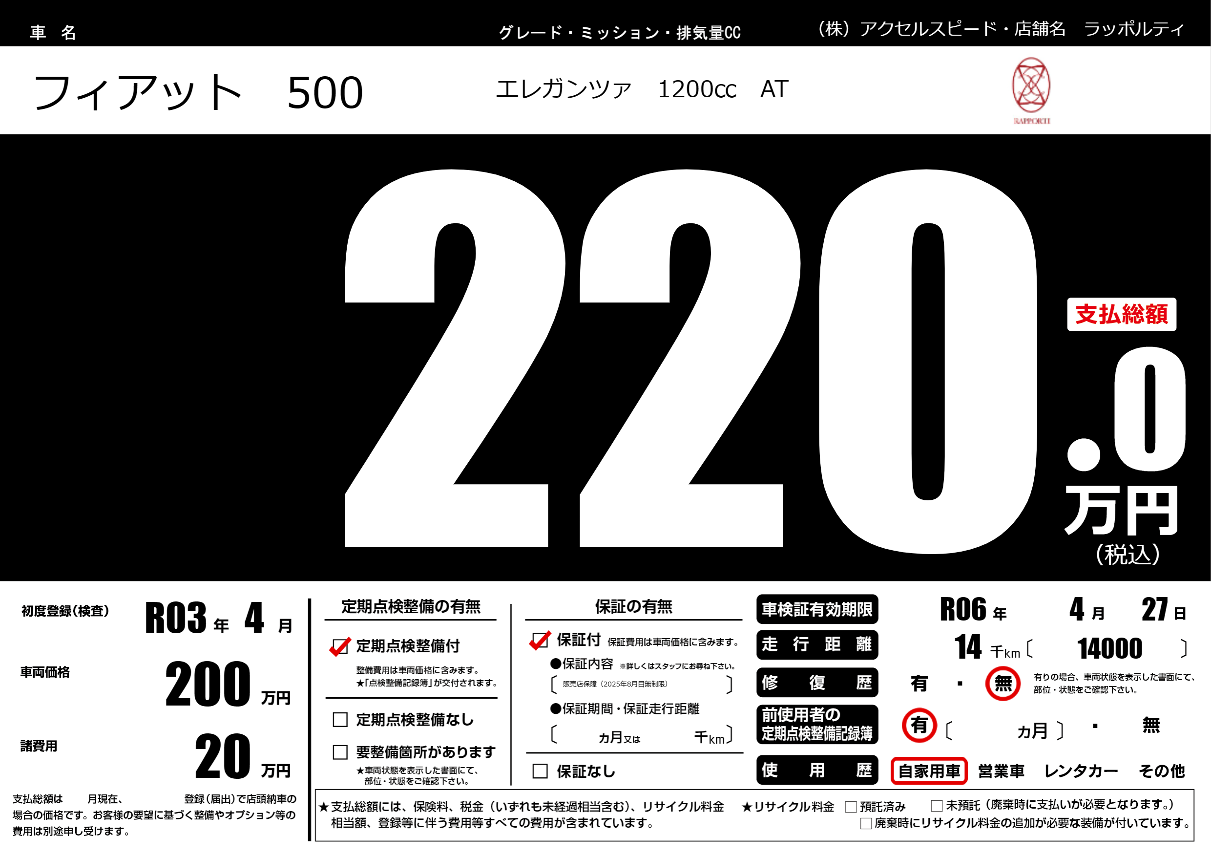 | 車名 | フィアット 500 | グレード ミッション 排気量 |