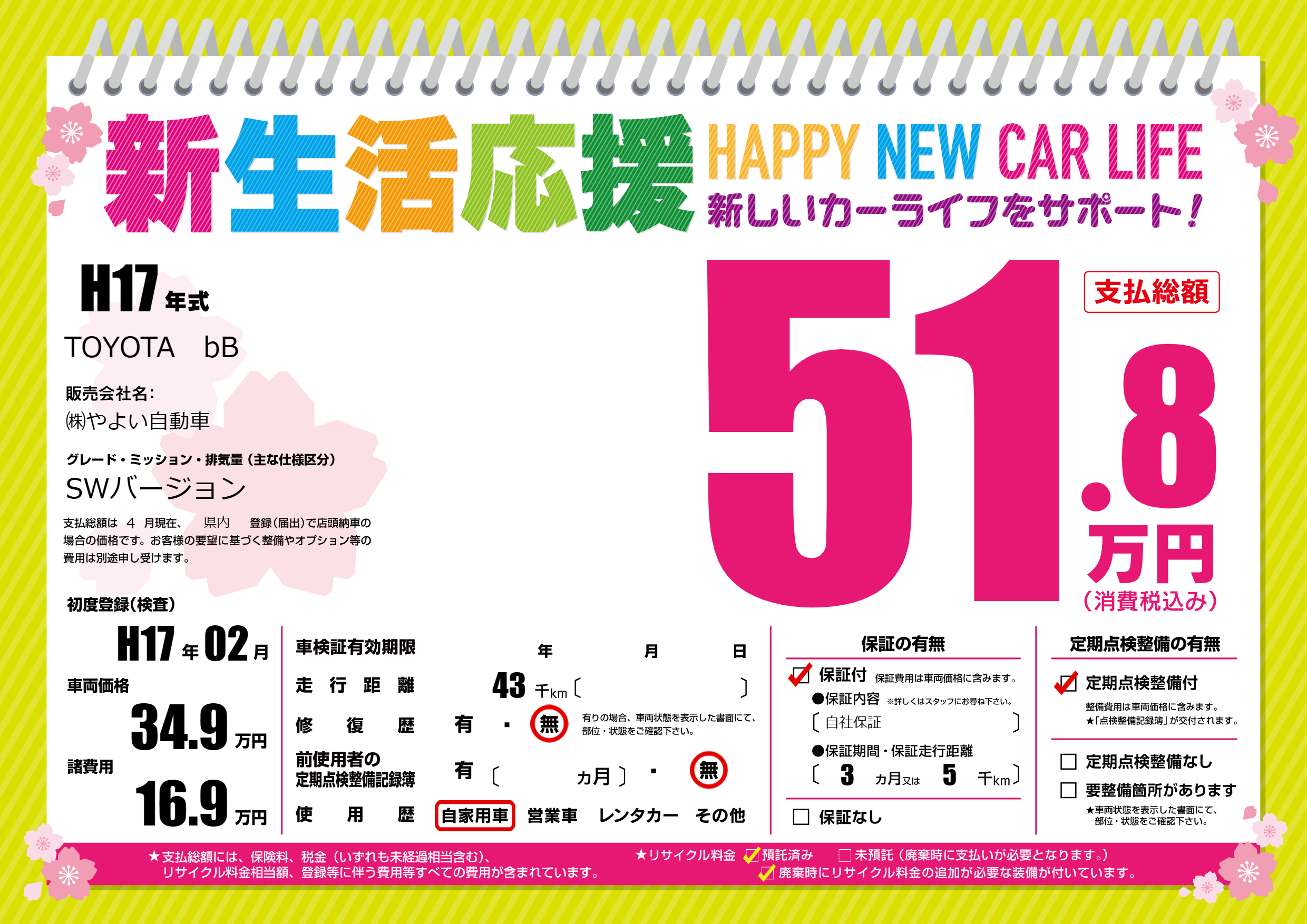 | 車名 | TOYOTA bB | グレード ミッション 排気量 |