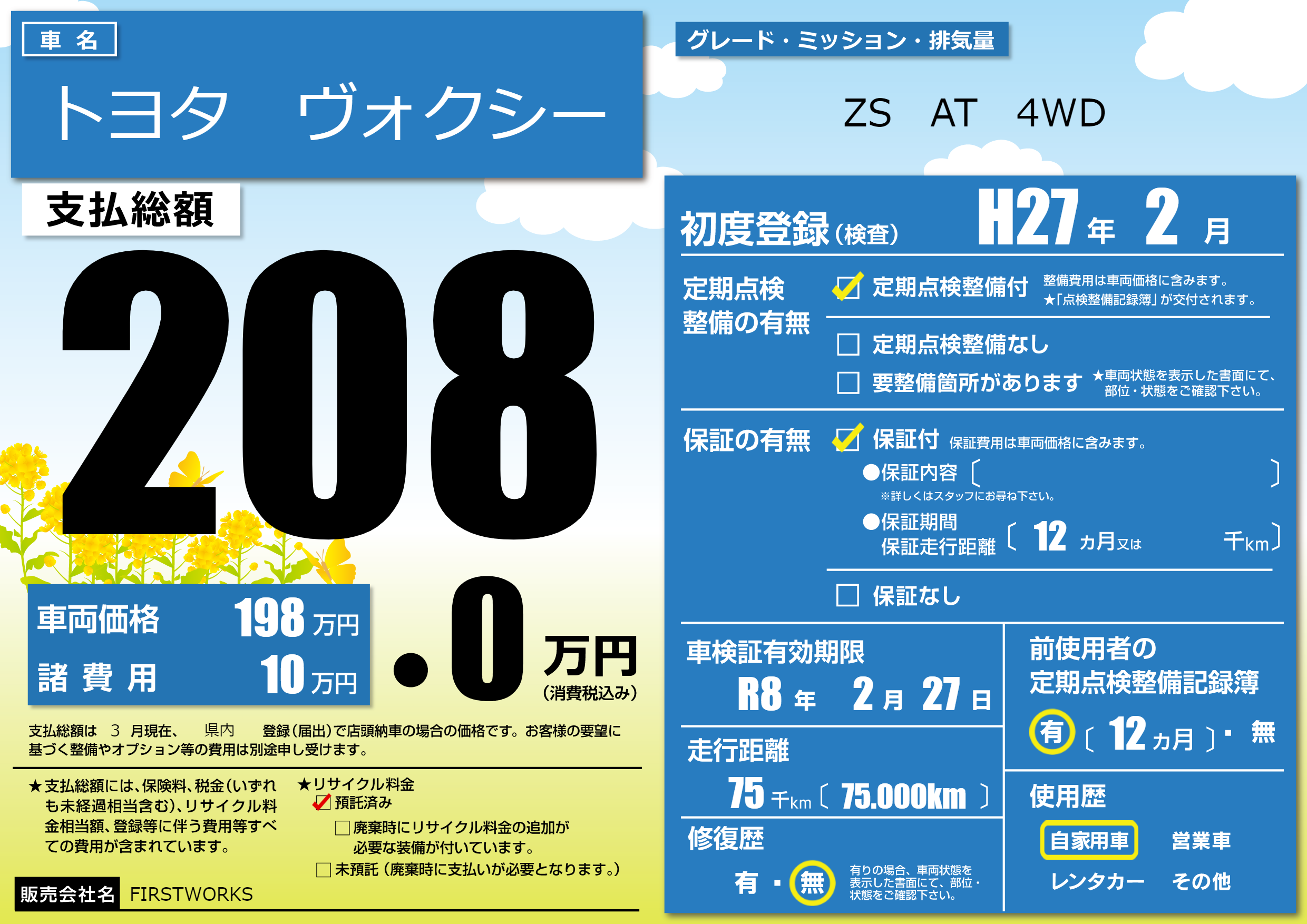 | 走行キロ | 7.5万km | 初年度登録 | H27年2月 |