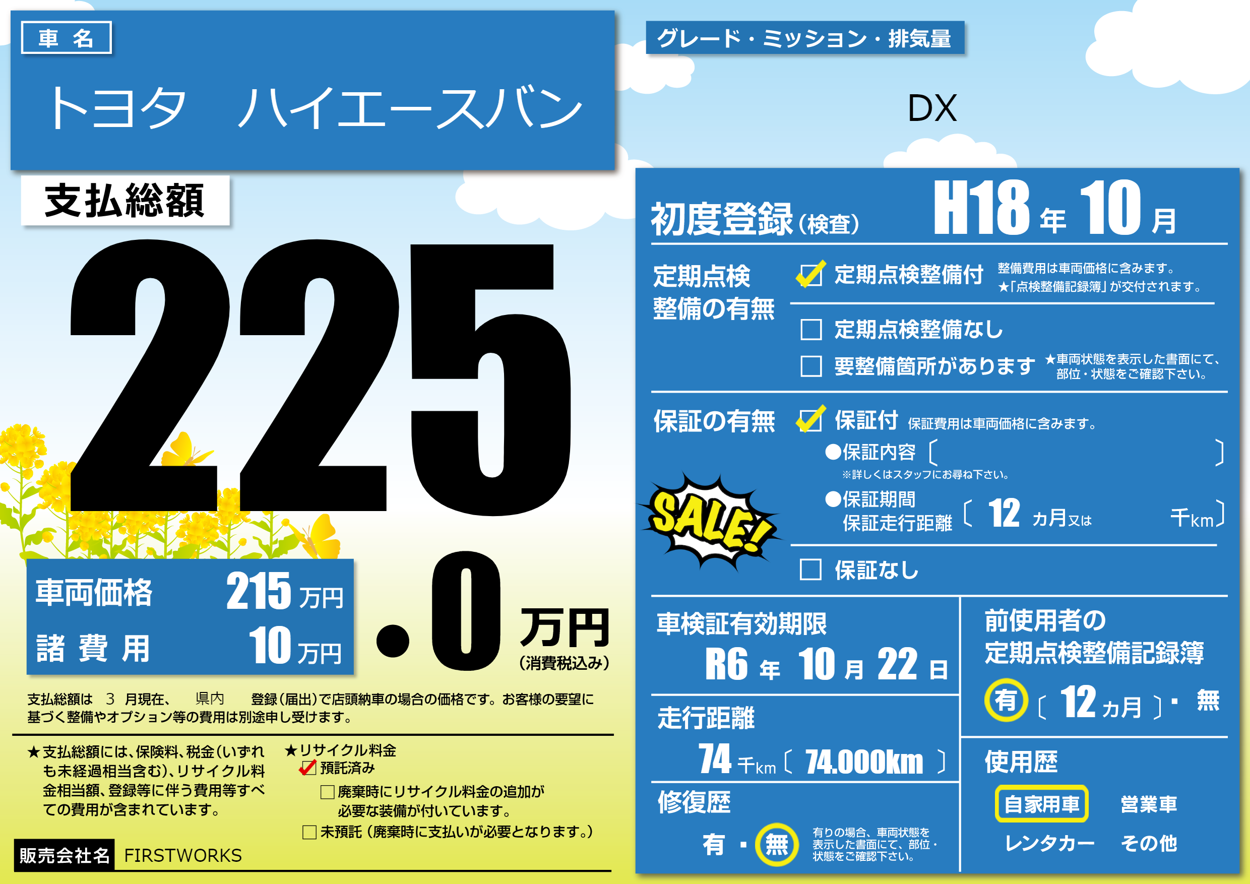 | 車名 | トヨタ ハイエースバン | グレード ミッション 排気量 |
