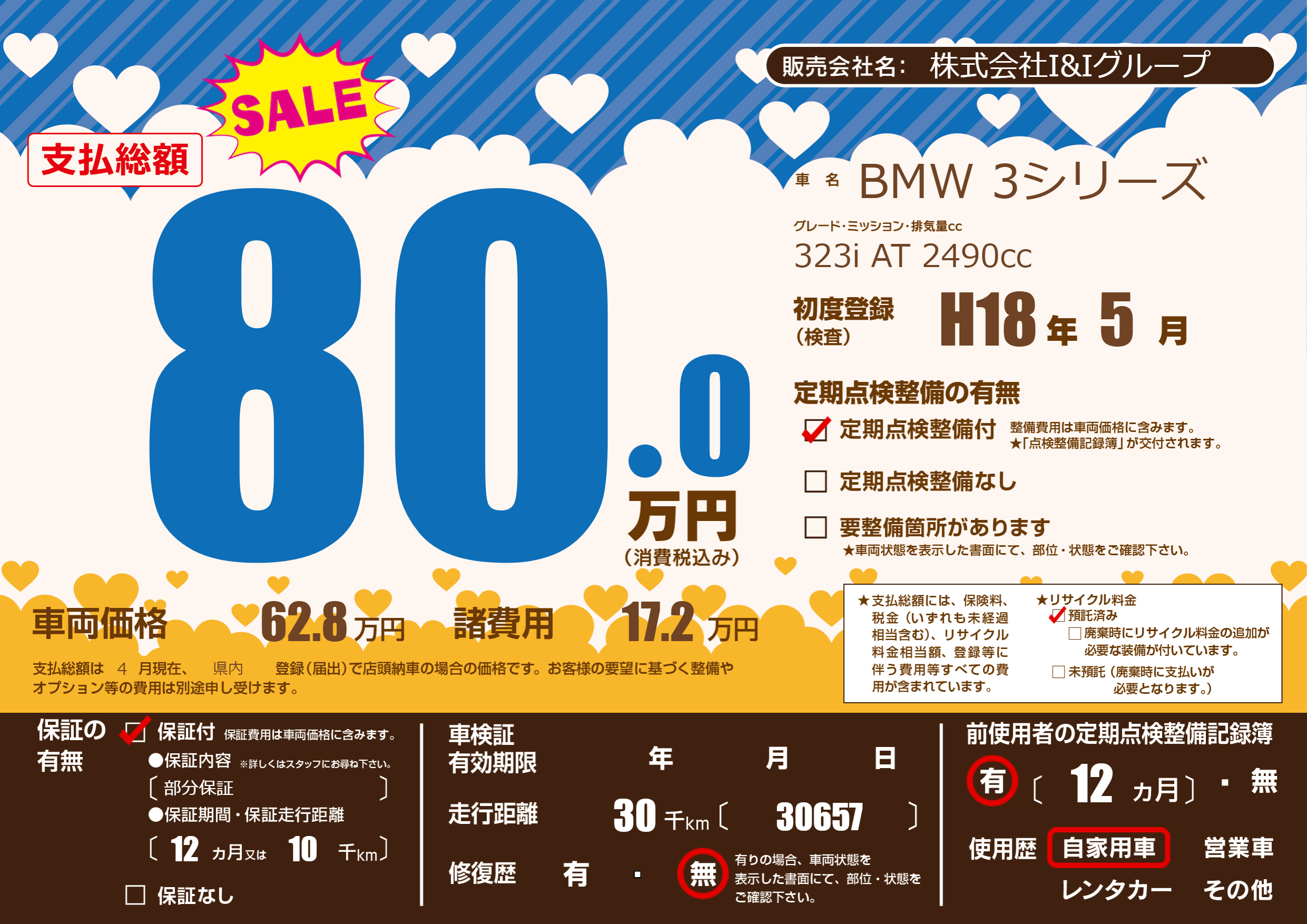 | 走行キロ | 3万km | 初年度登録 | H18年5月 |