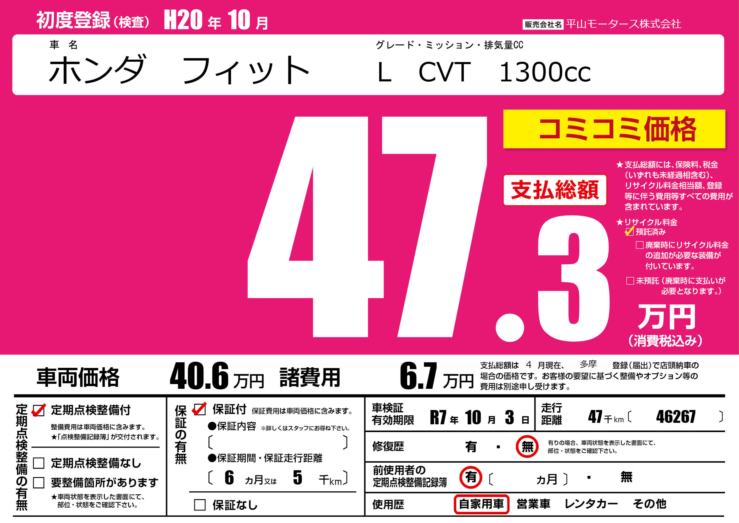 | 走行キロ | 4.7万km | 初年度登録 | H20年10月 |