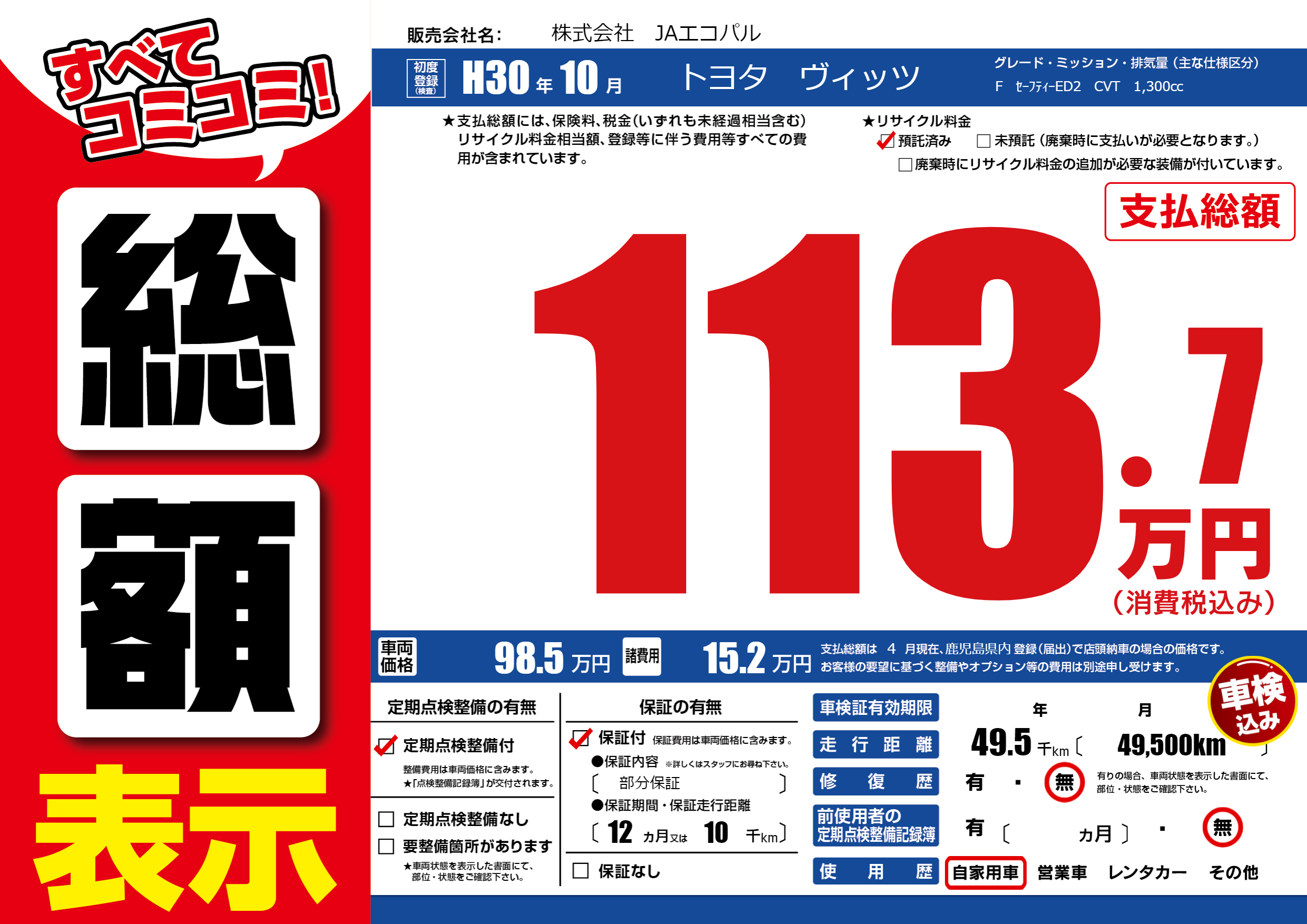 | 車名 | トヨタ ヴィッツ | グレード ミッション 排気量 |