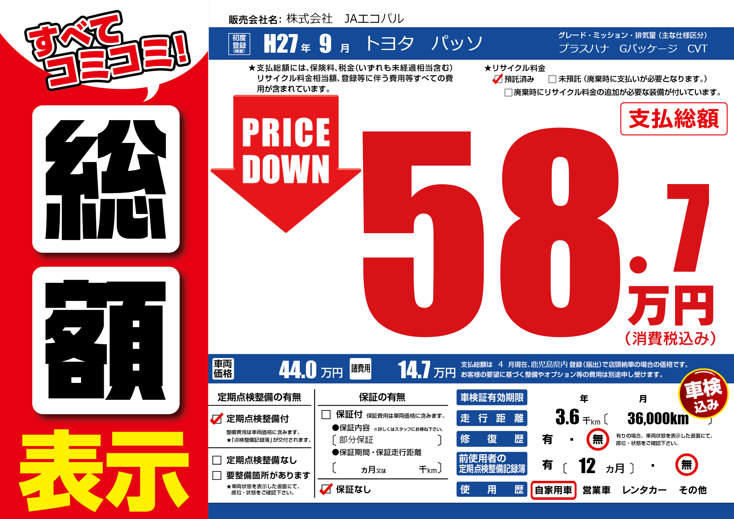 | 車名 | トヨタ パッソ | グレード ミッション 排気量 |