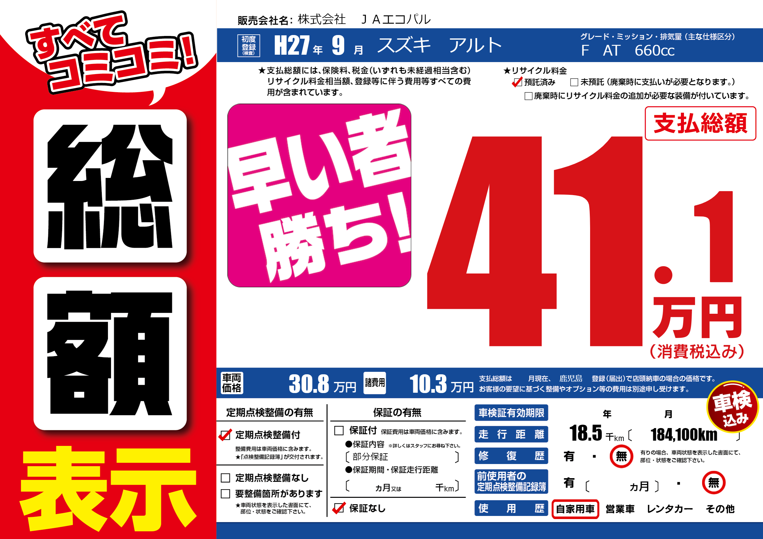 | 車名 | スズキ アルト | グレード ミッション 排気量 |