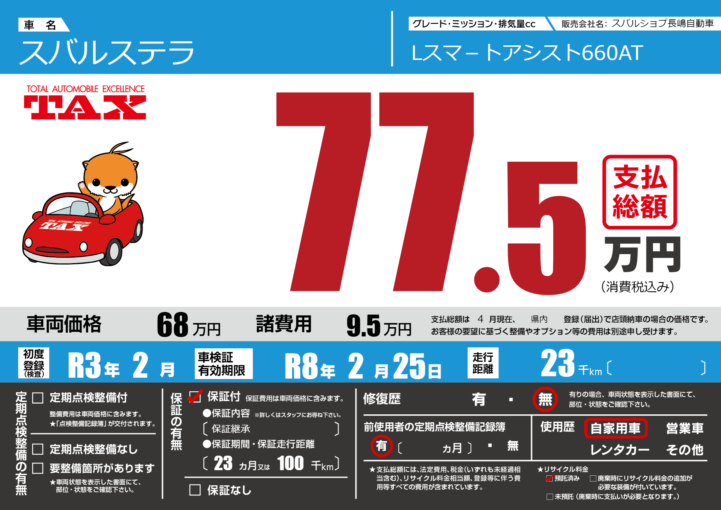 保証付き 保証内容(保証継承) 23ヶ月または(100)千kmまで |
