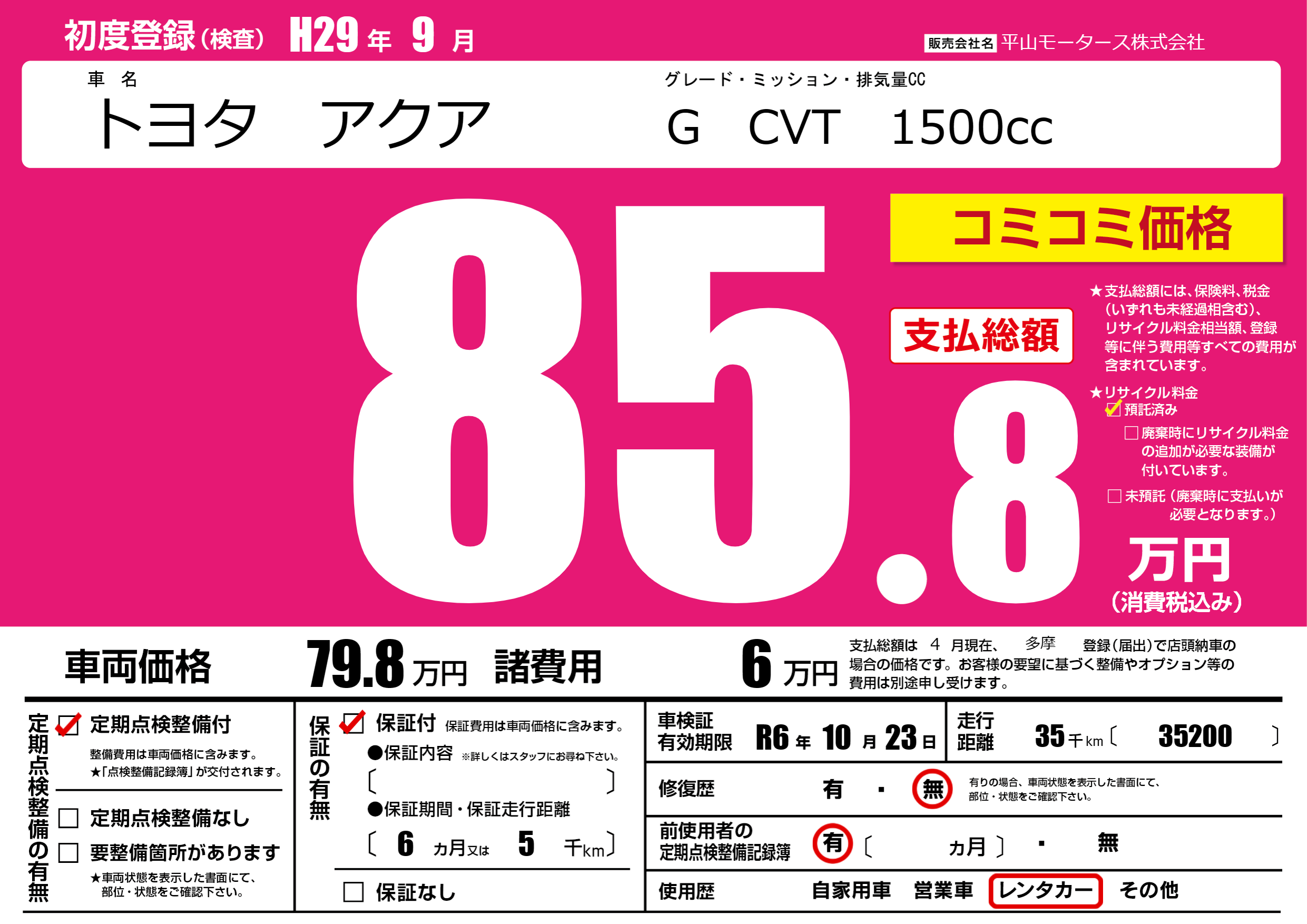 | 走行キロ | 3.5万km | 初年度登録 | H29年9月 |