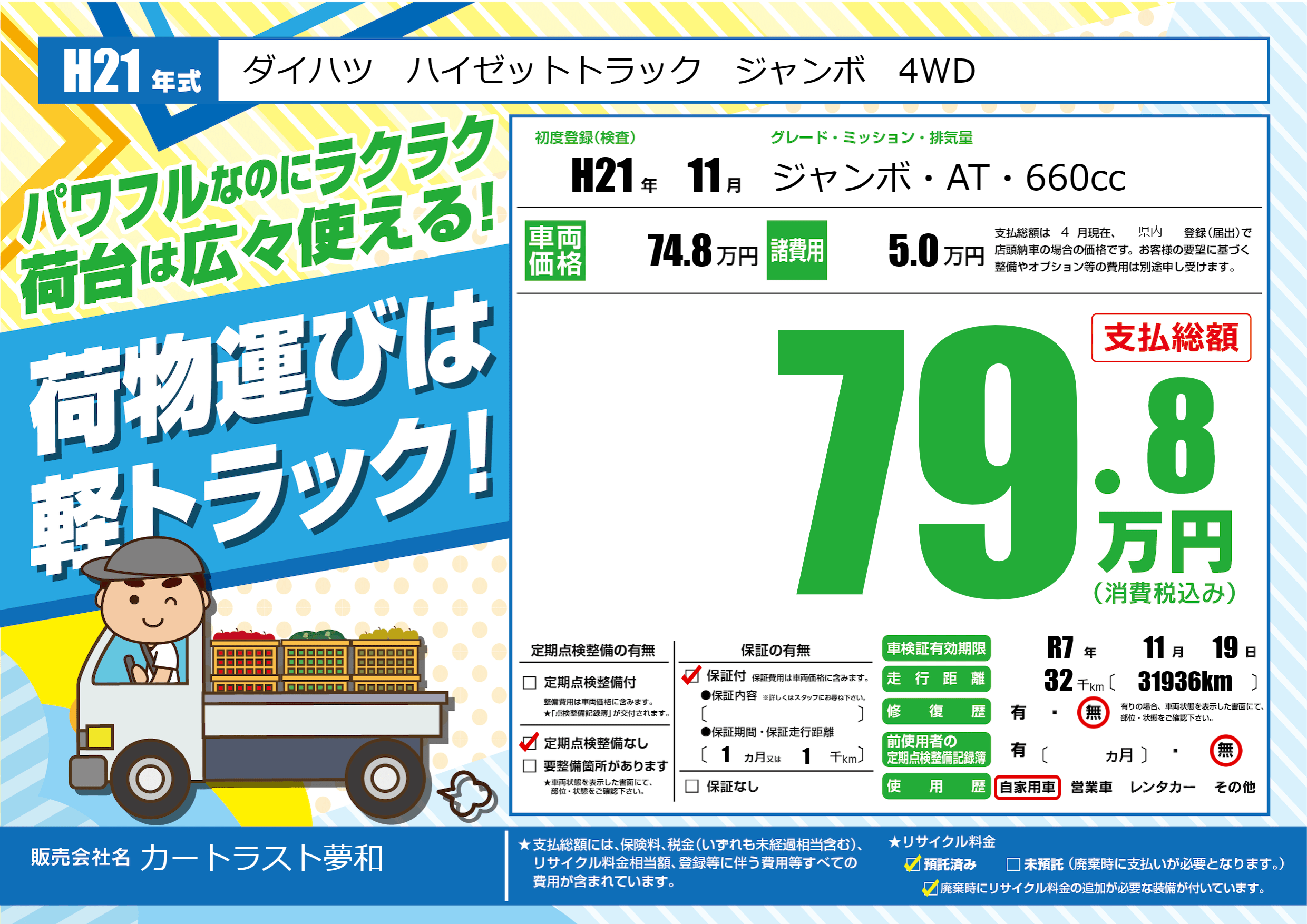 | 車名 | ダイハツ ハイゼットトラック ジャンボ 4WD | グレード ミッション 排気量 |