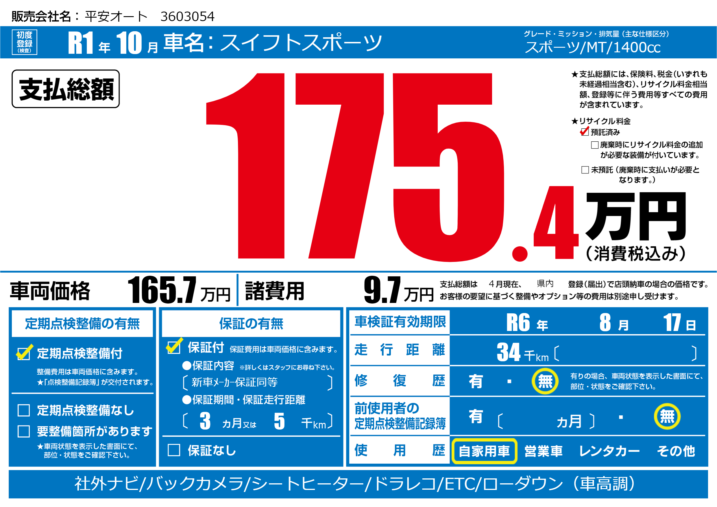 | 車名 | スイフトスポーツ | グレード ミッション 排気量 |