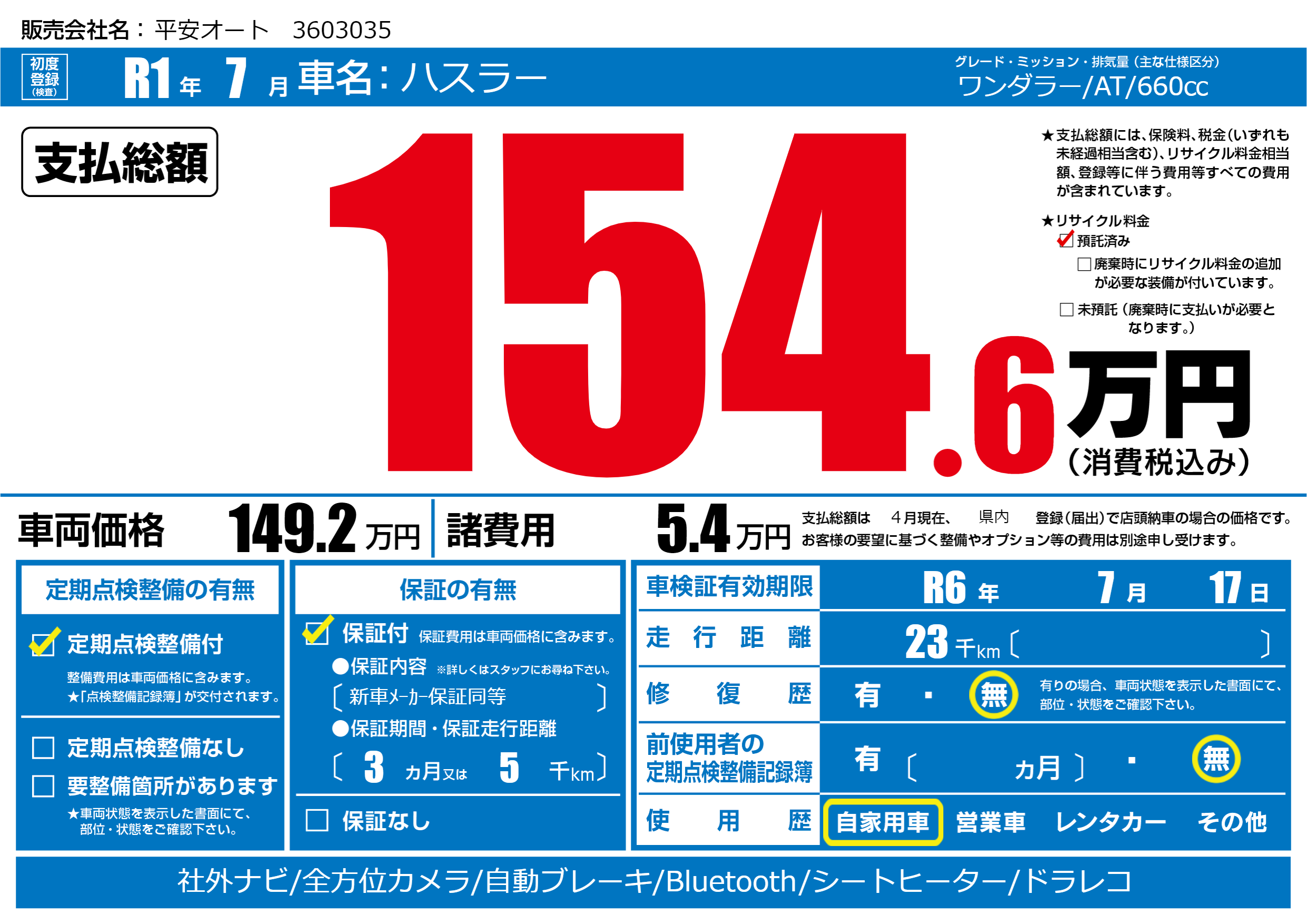| 車名 | ハスラー | グレード ミッション 排気量 |