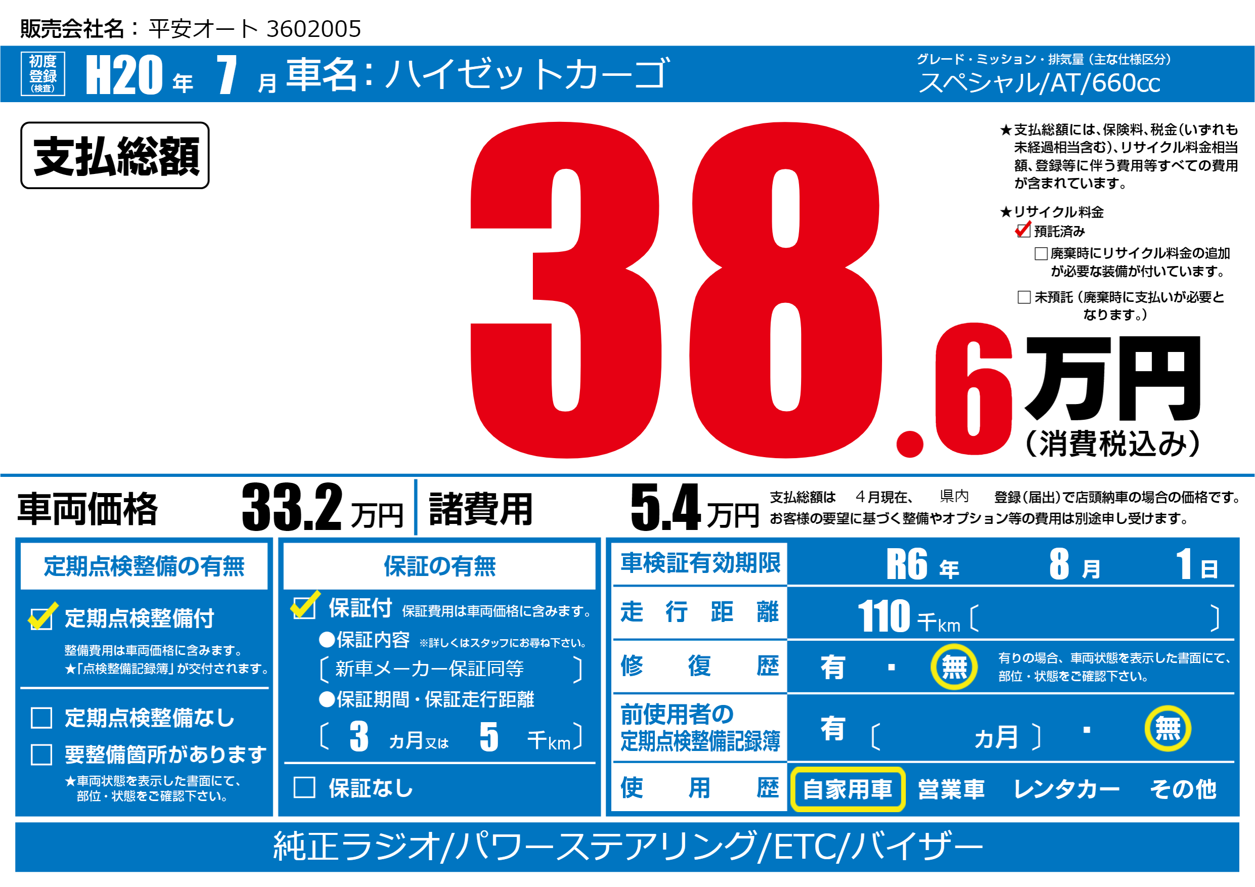 | 車検制限 | R6年 8月 1日 | ||