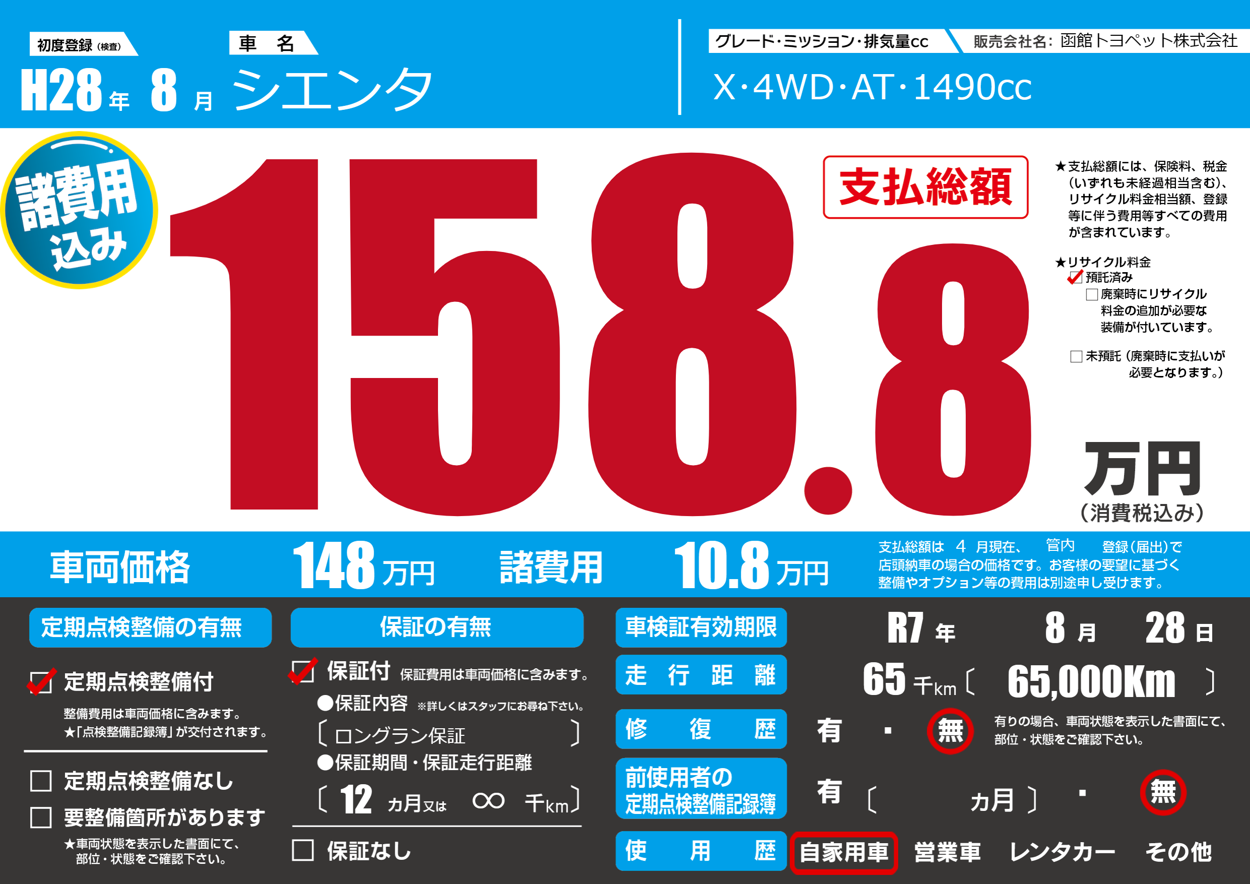 | 走行キロ | 6.5万km | 初年度登録 | H28年8月 |