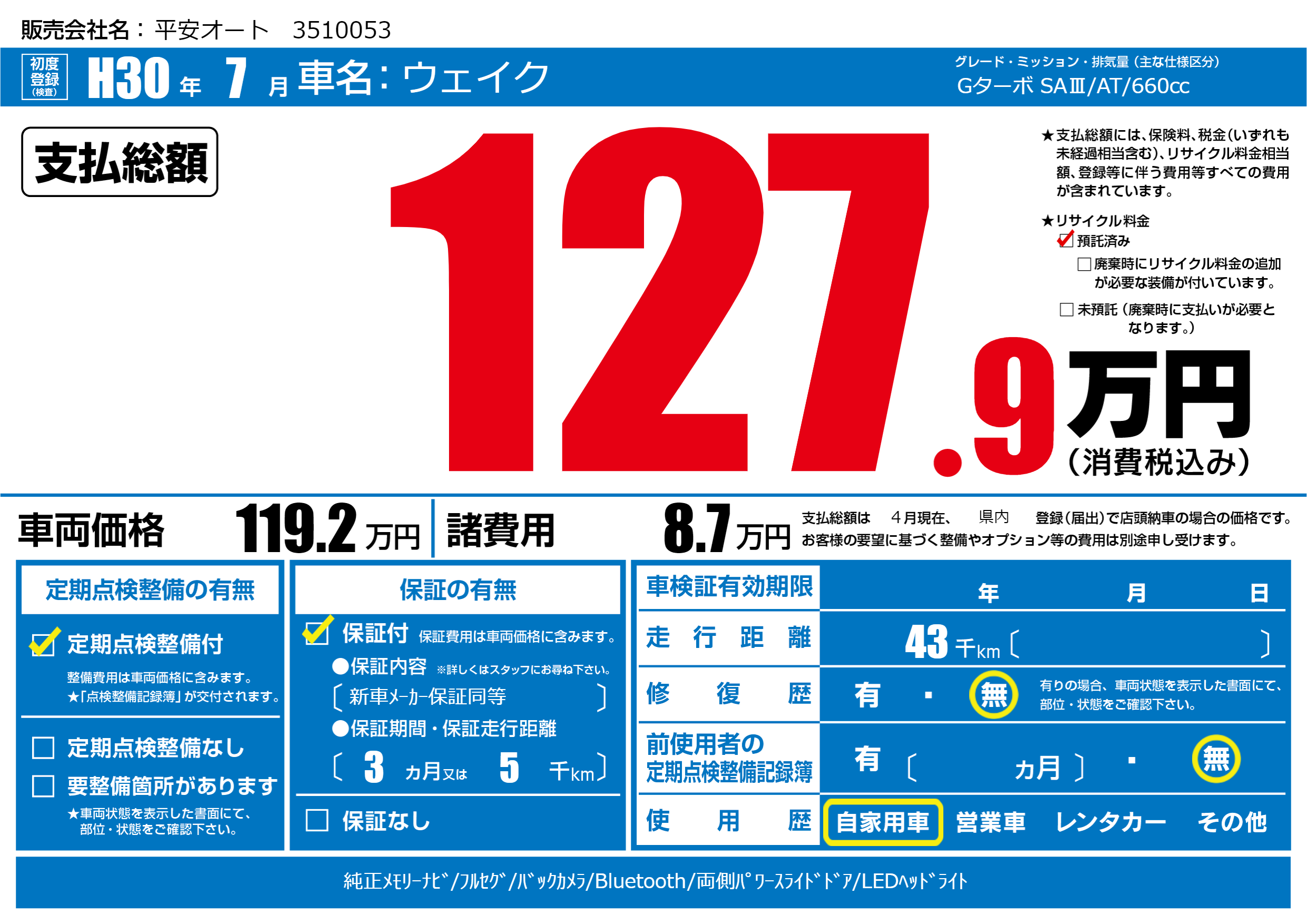 | 走行キロ | 4.3万km | 初年度登録 | H30年7月 |