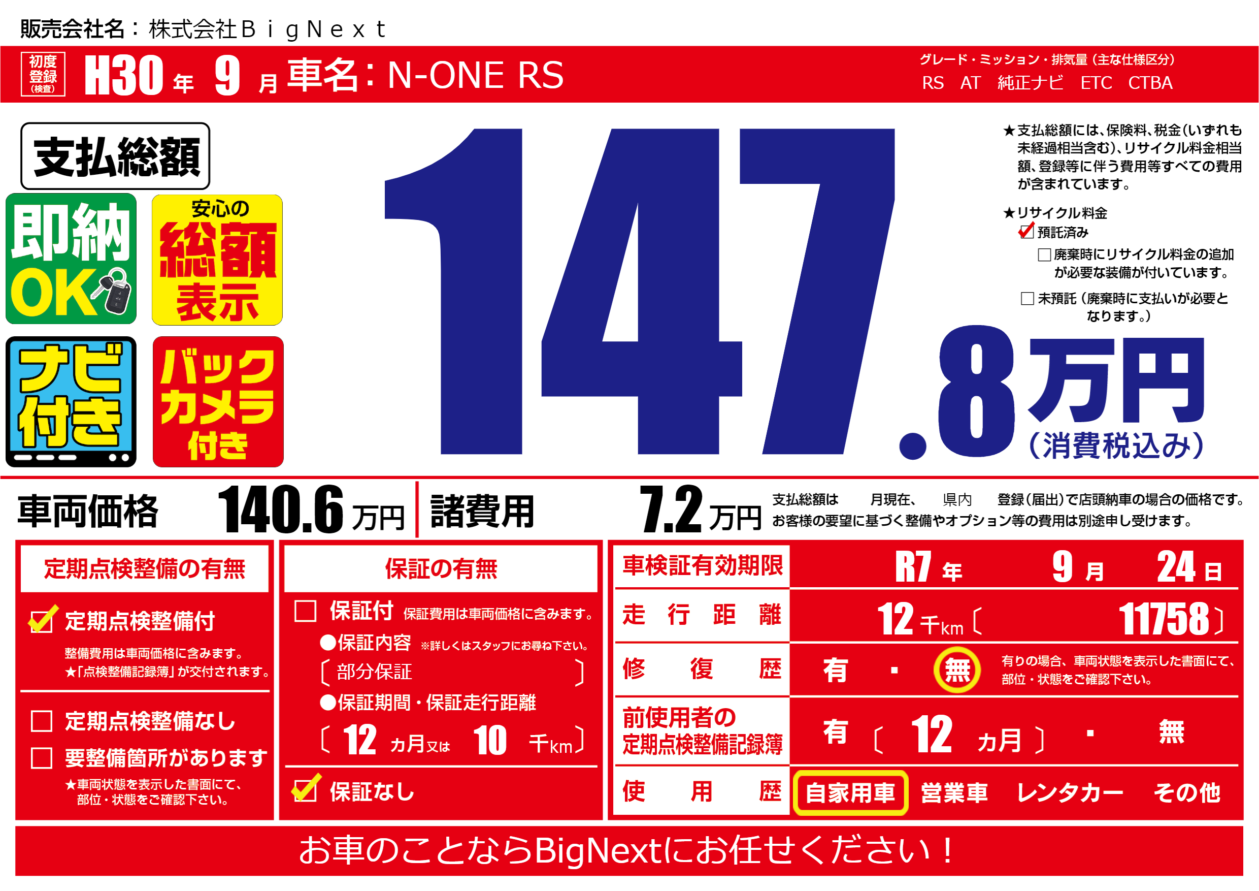 | 車検制限 | R7年 9月 24日 | ||