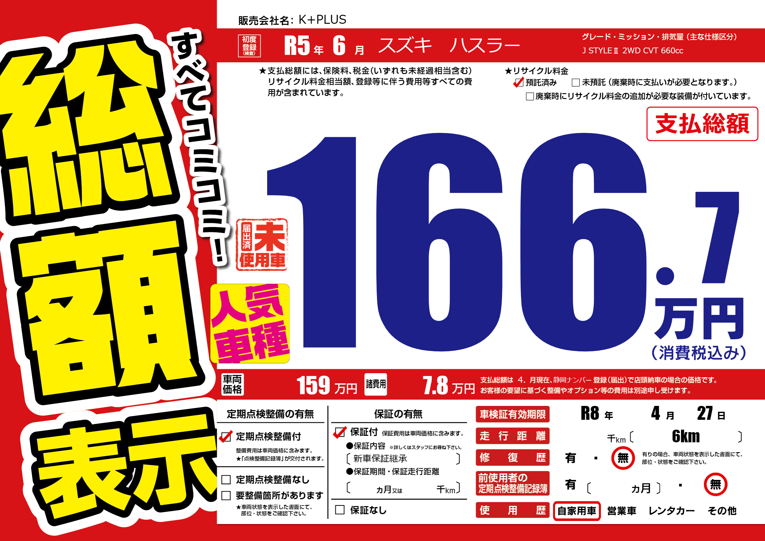 | 車名 | スズキ ハスラー | グレード ミッション 排気量 |
