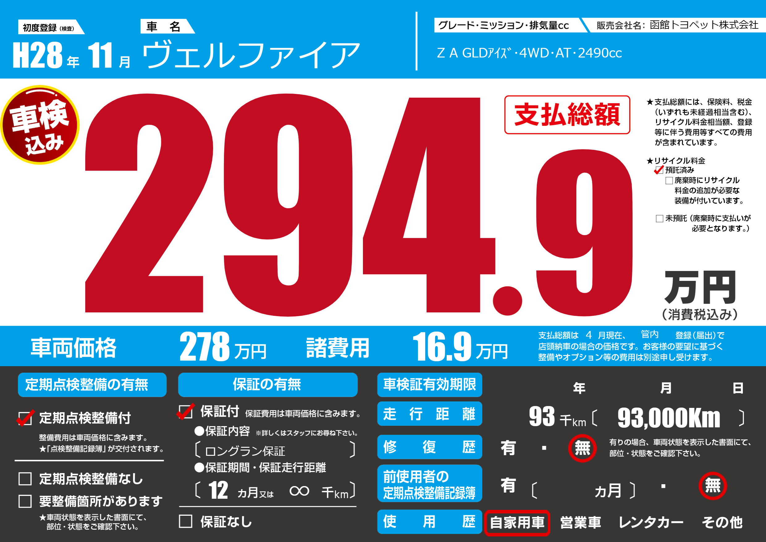 | 走行キロ | 9.3万km | 初年度登録 | H28年11月 |