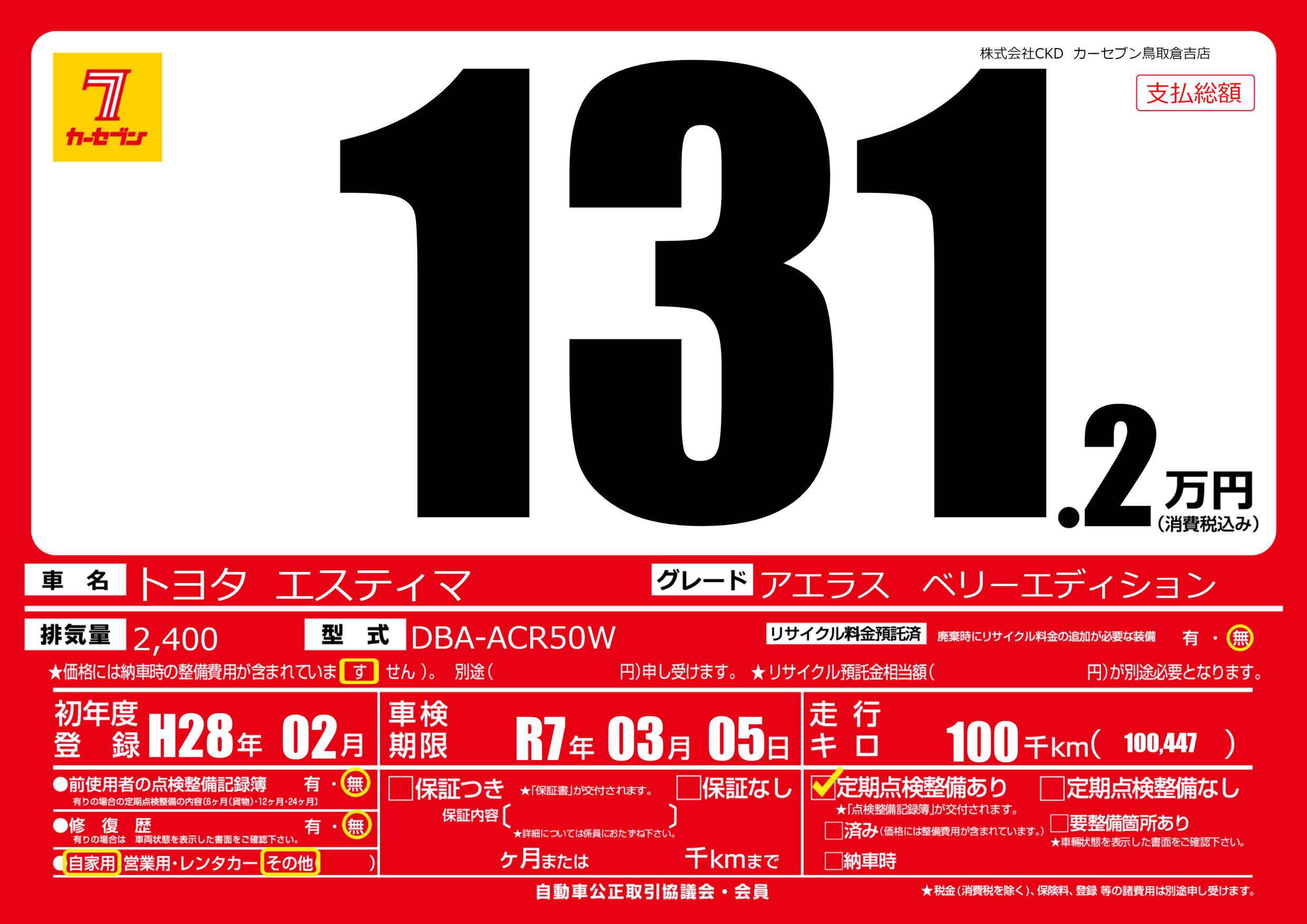 | 車名 | トヨタ エスティマ | グレード ミッション 排気量 |