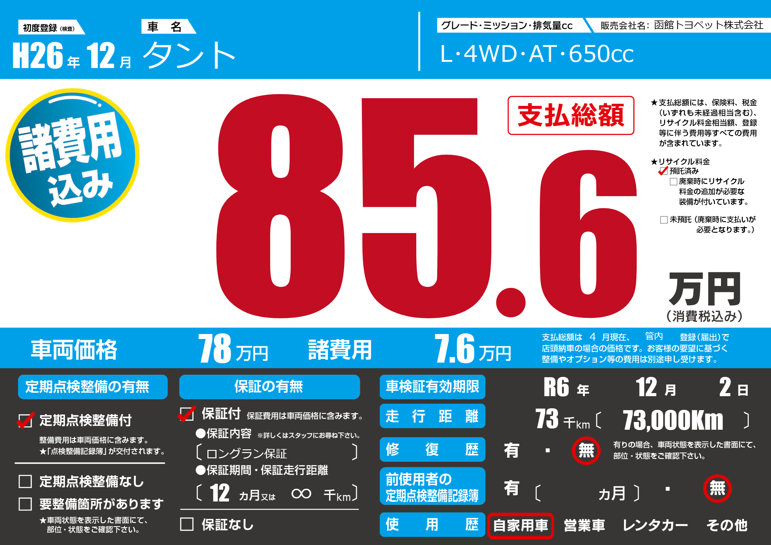| 走行キロ | 7.3万km | 初年度登録 | H26年12月 |