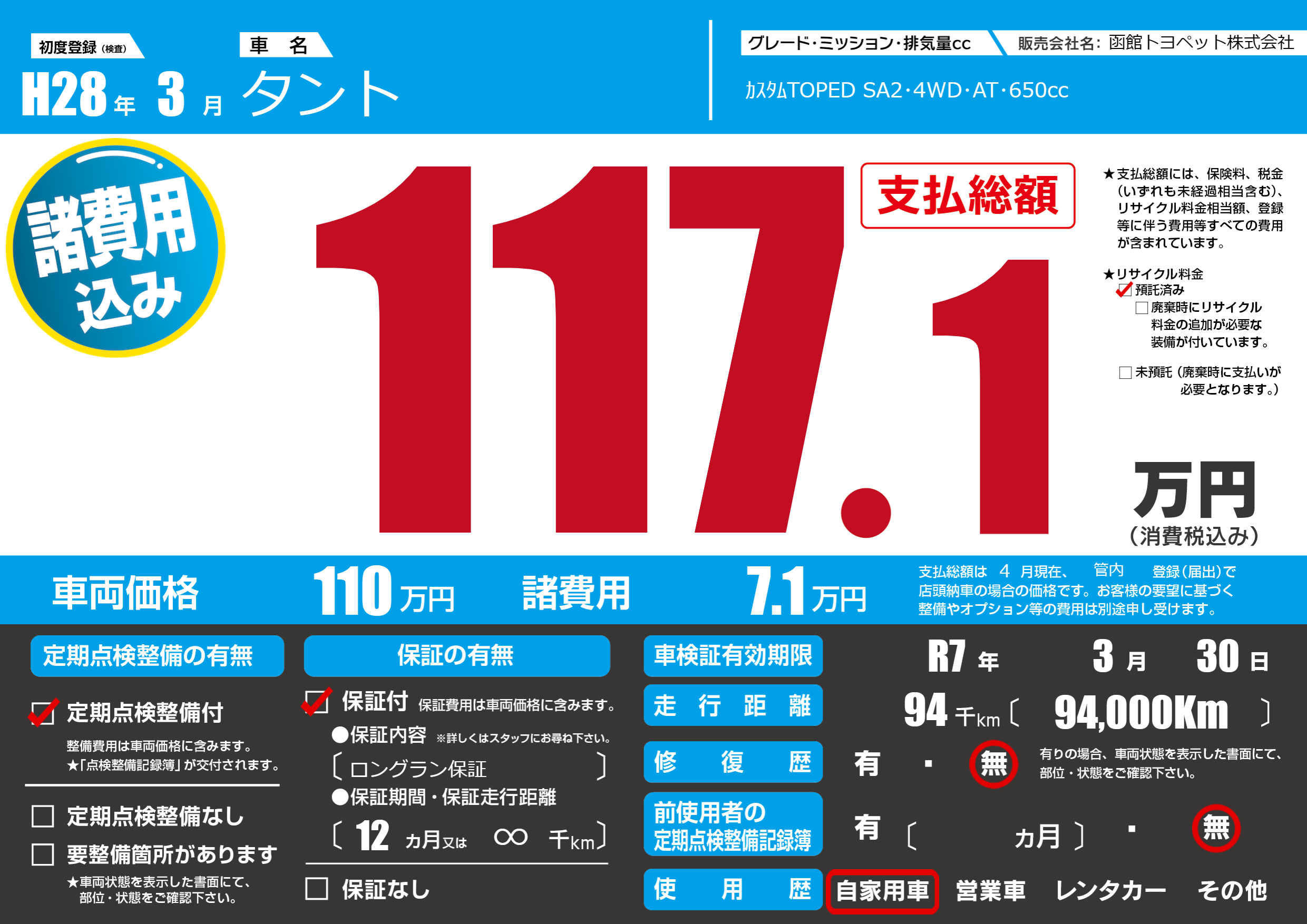 | 車検制限 | R7年 3月 30日 | ||