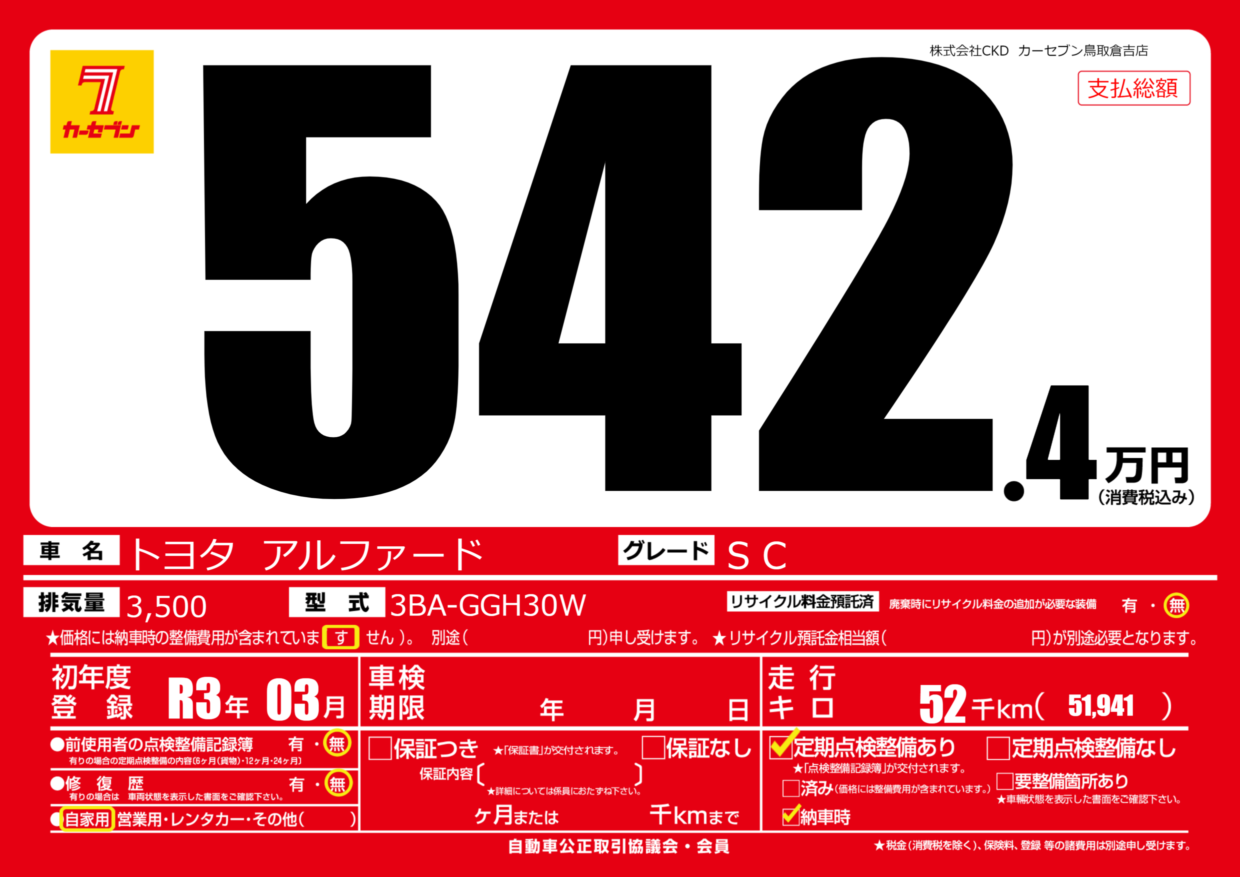 | 車名 | トヨタ アルファード | グレード ミッション 排気量 |