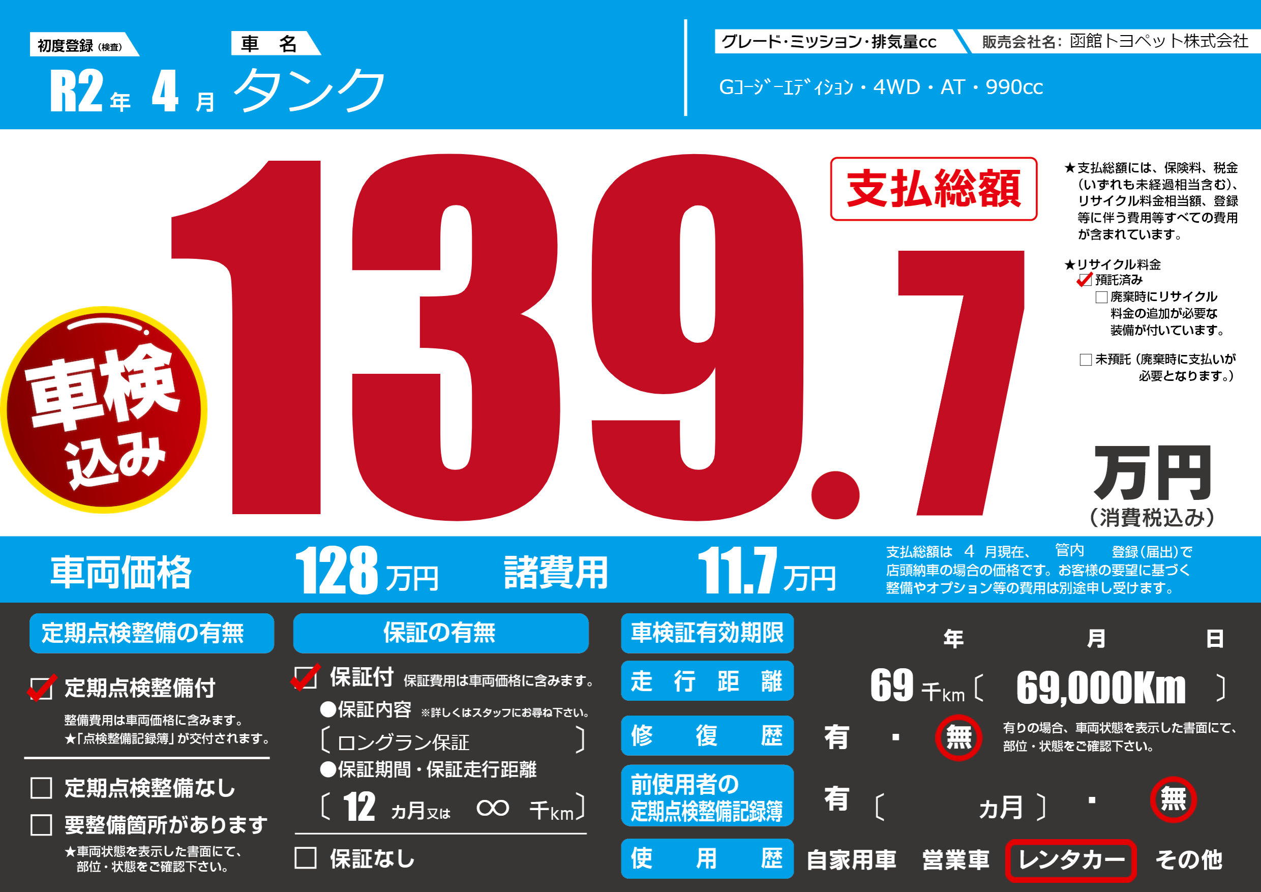 | 走行キロ | 6.9万km | 初年度登録 | R2年4月 |