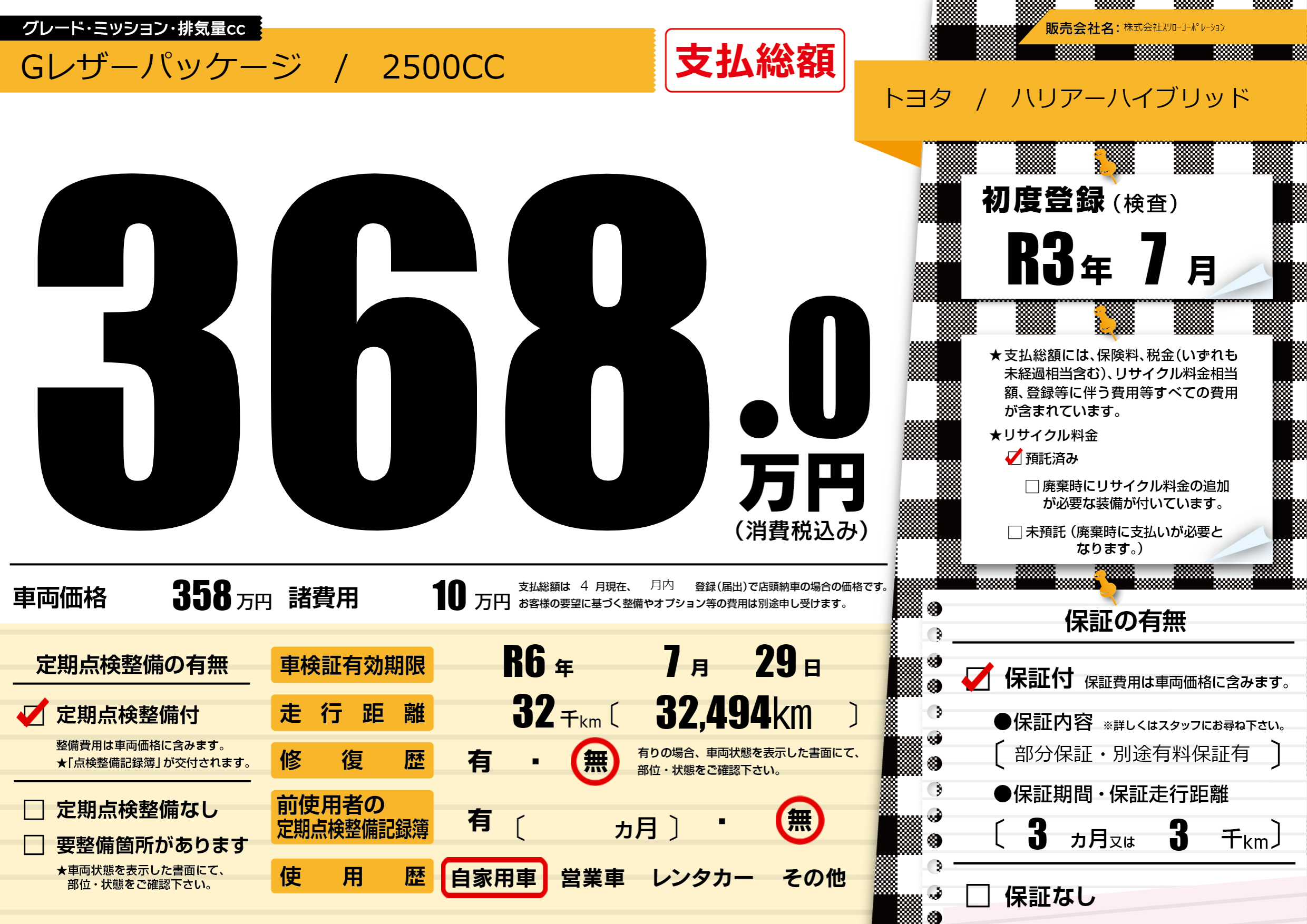| 車名 | トヨタ / ハリアーハイブリッド | グレード ミッション 排気量 |