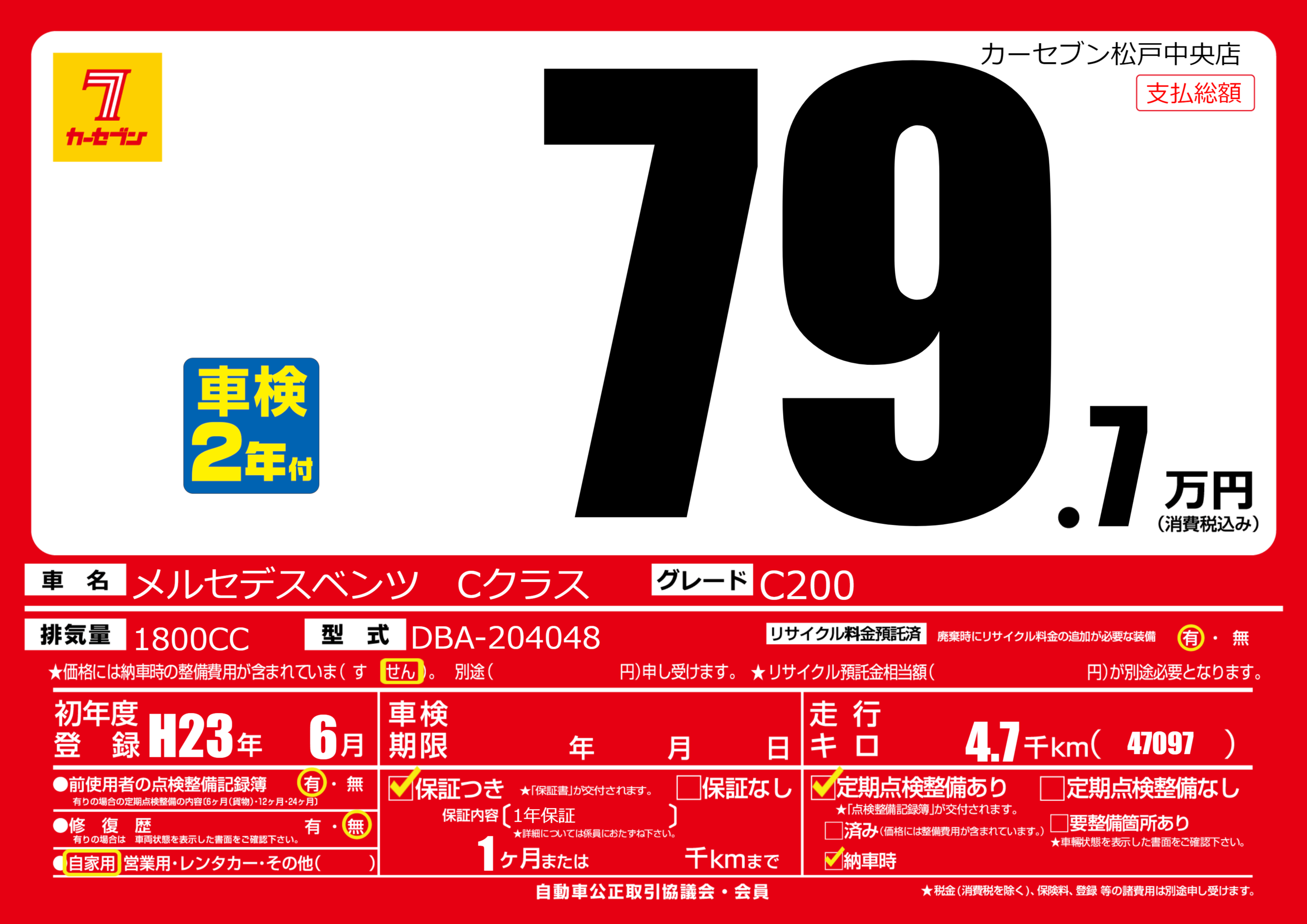 | 車名 | メルセデスベンツ Cクラス | グレード ミッション 排気量 |