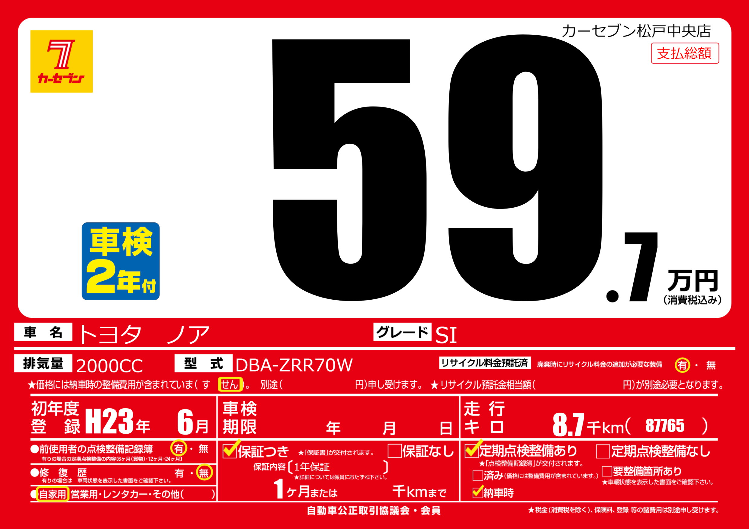| 走行キロ | 0.8万km | 初年度登録 | H23年6月 |