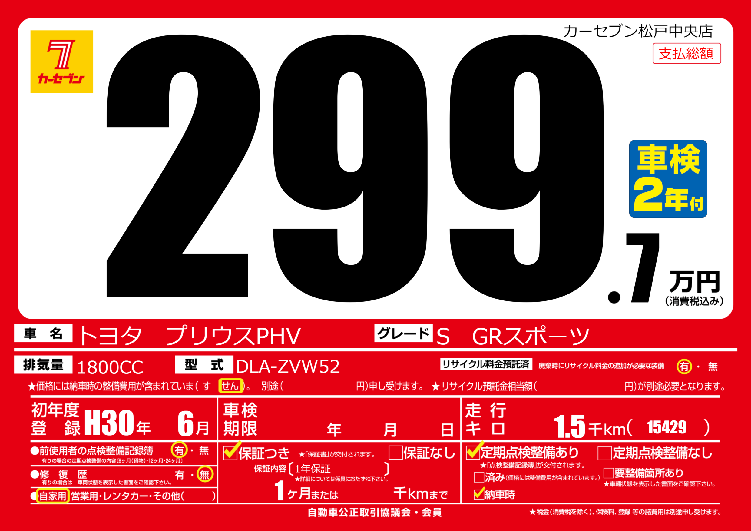 | 車名 | トヨタ プリウスPHV | グレード ミッション 排気量 |