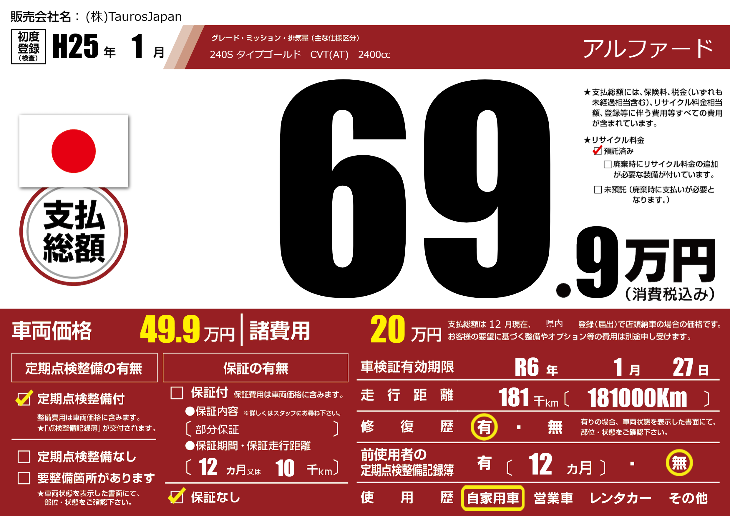 | 車名 | アルファード | グレード ミッション 排気量 |