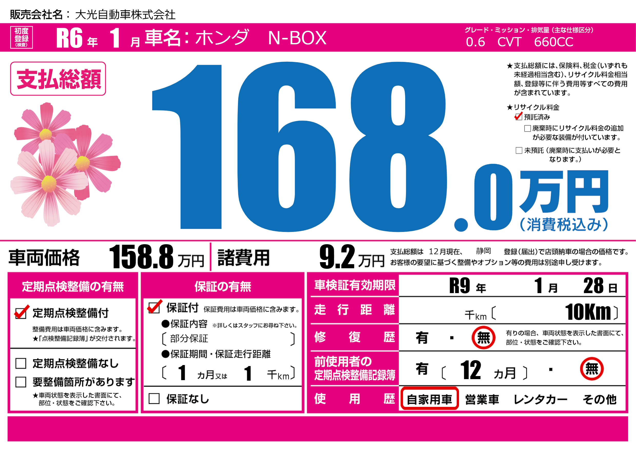 | 車名 | ホンダ N-BOX | グレード ミッション 排気量 |