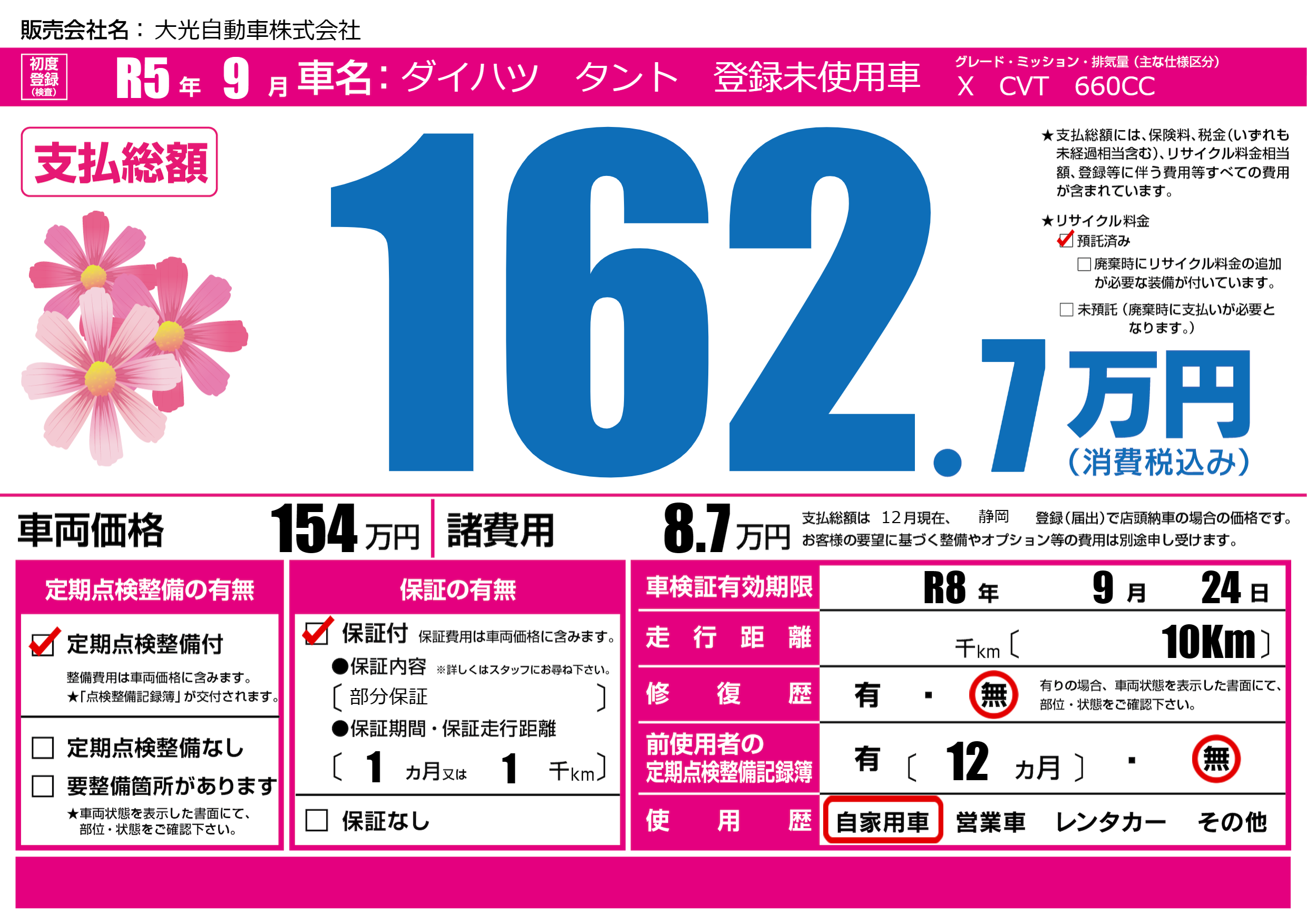 | 車名 | ダイハツ タント 登録未使用車 | グレード ミッション 排気量 |