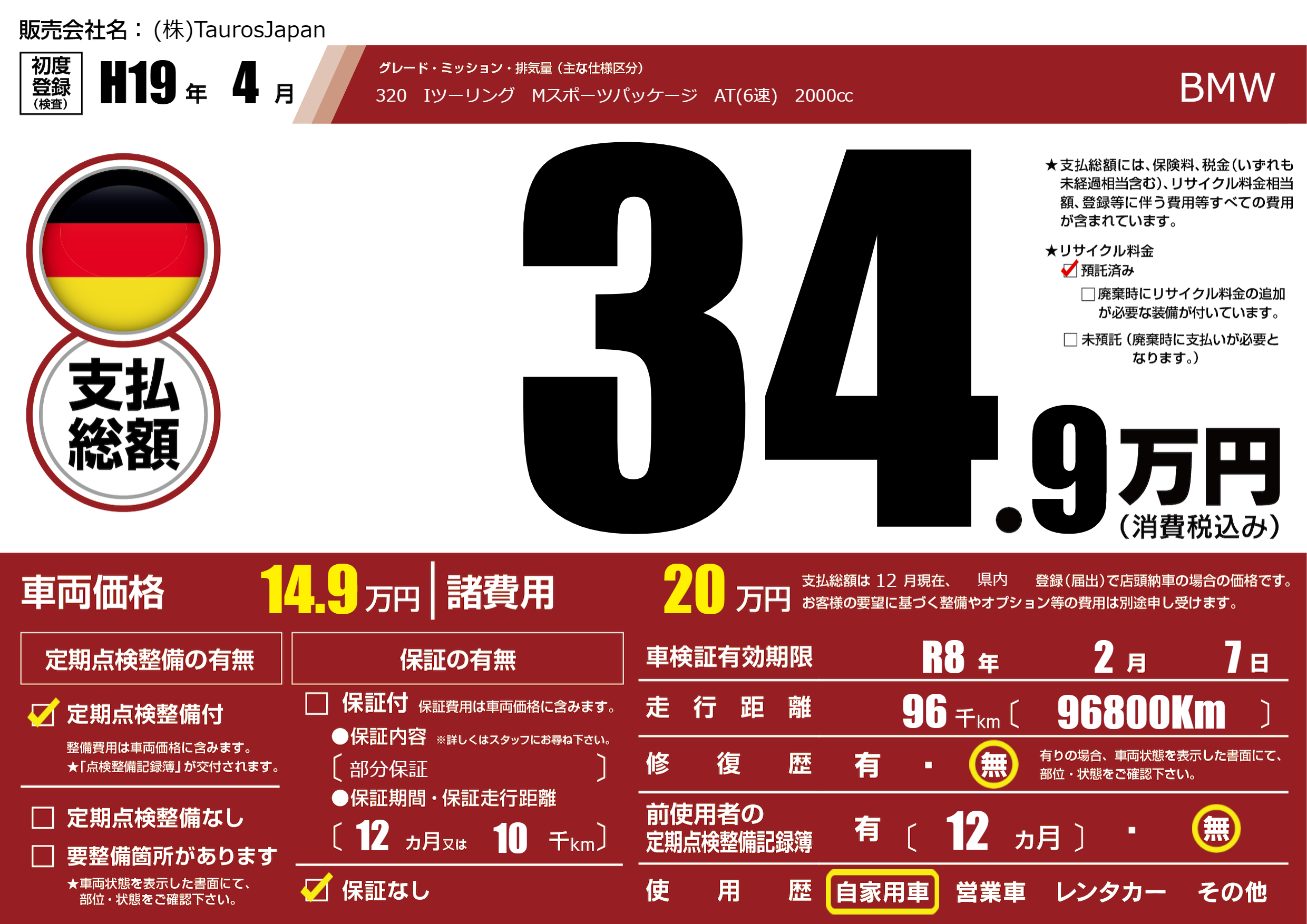 320 Iツーリング Mスポーツパッケージ AT(6速) 2000㏄ |