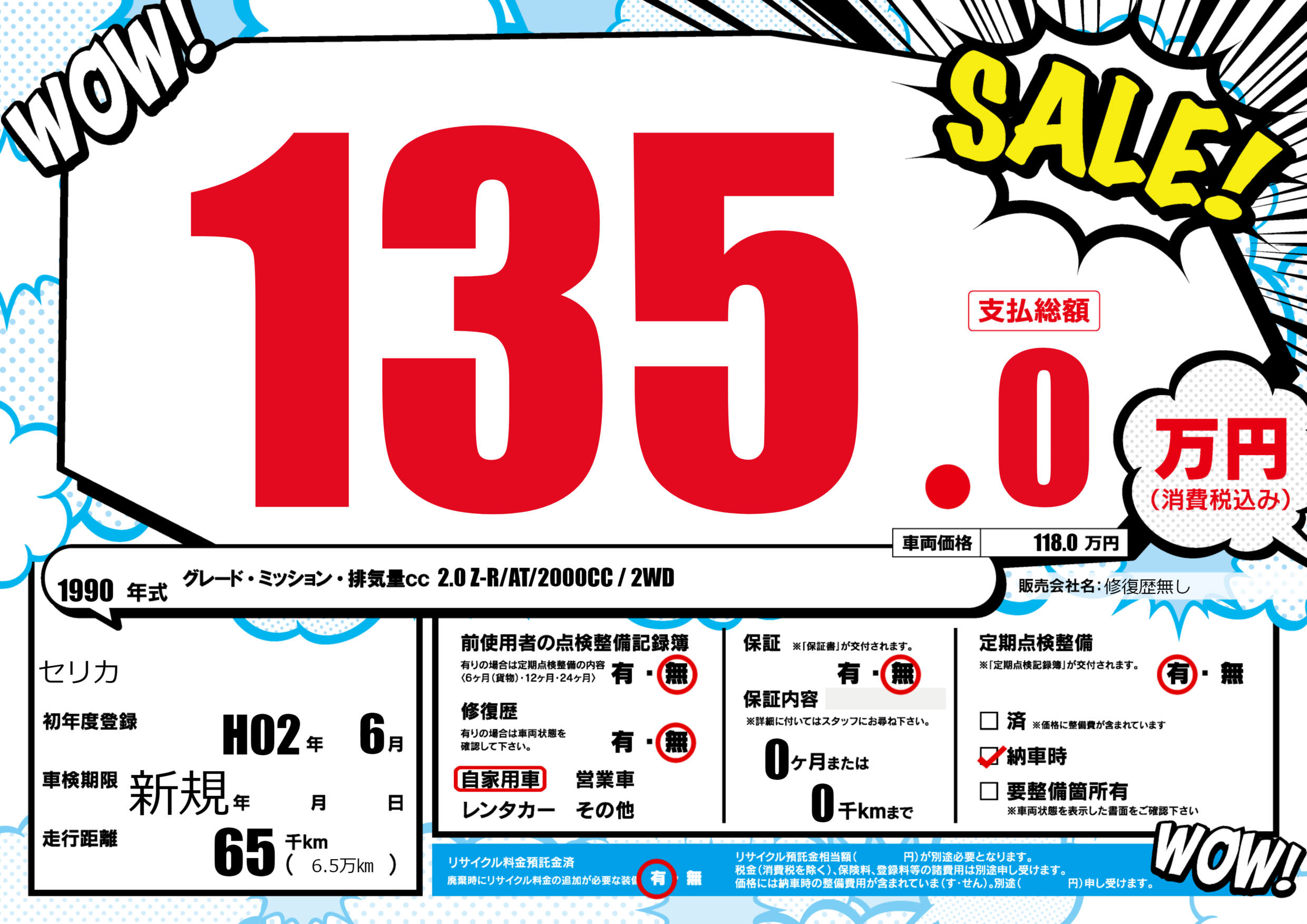 | 走行キロ | 6.5万km | 初年度登録 | H02年6月 |