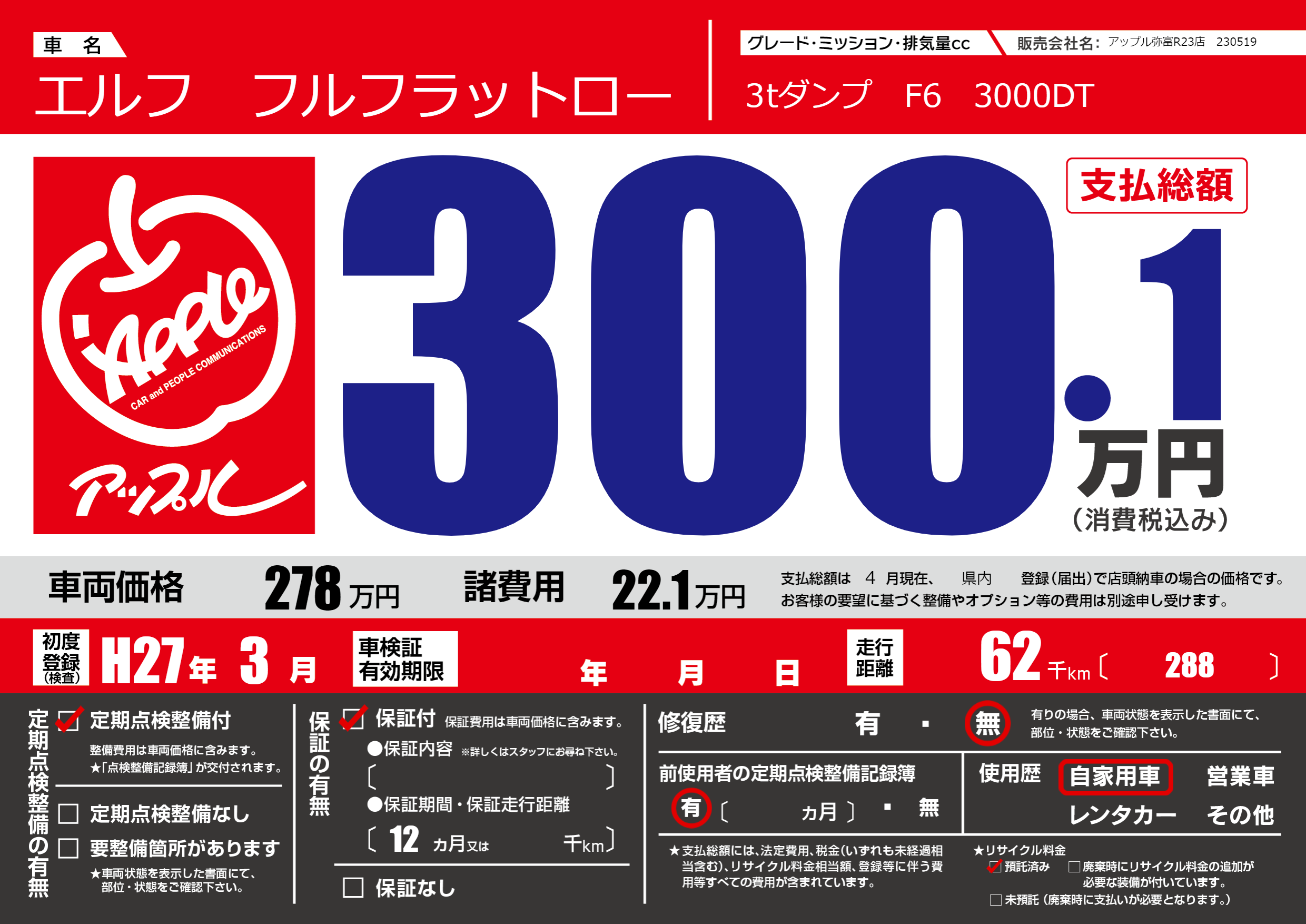 | 車名 | エルフ フルフラットロー | グレード ミッション 排気量 |