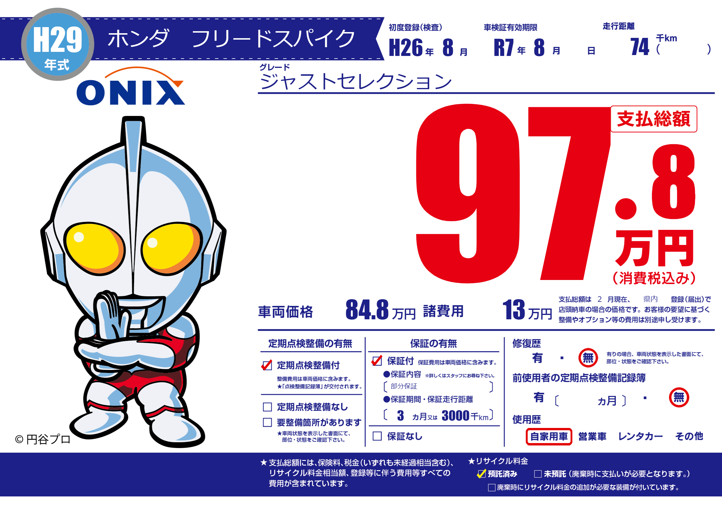 | 車名 | ホンダ フリードスパイク | グレード ミッション 排気量 |