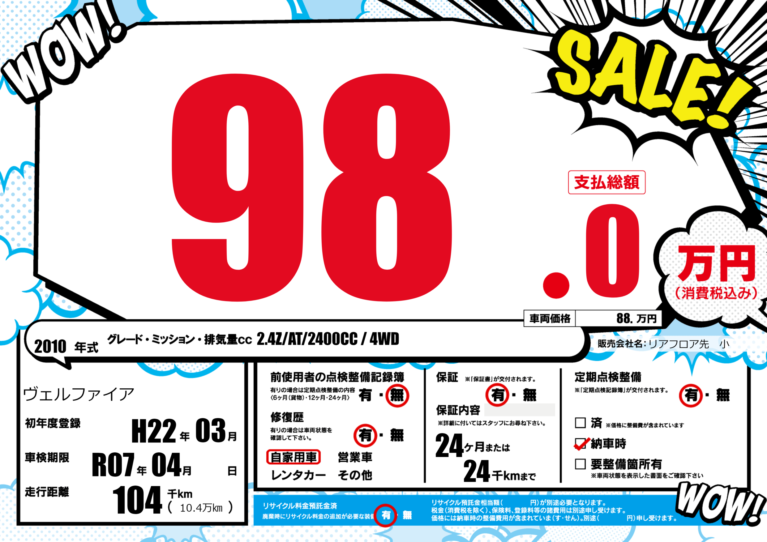 | 車名 | ヴェルファイア | グレード ミッション 排気量 |