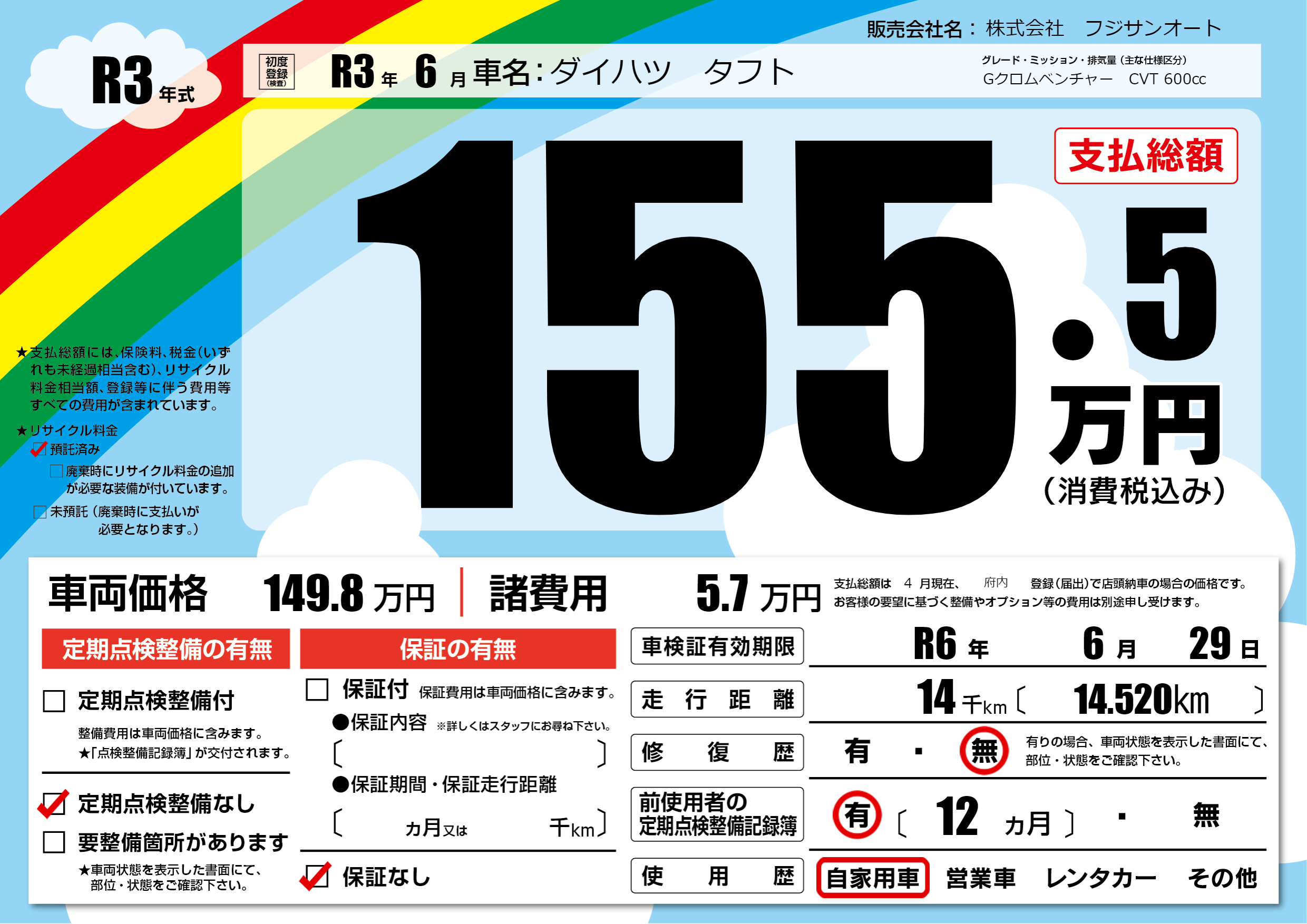 | 車名 | ダイハツ タフト | グレード ミッション 排気量 |