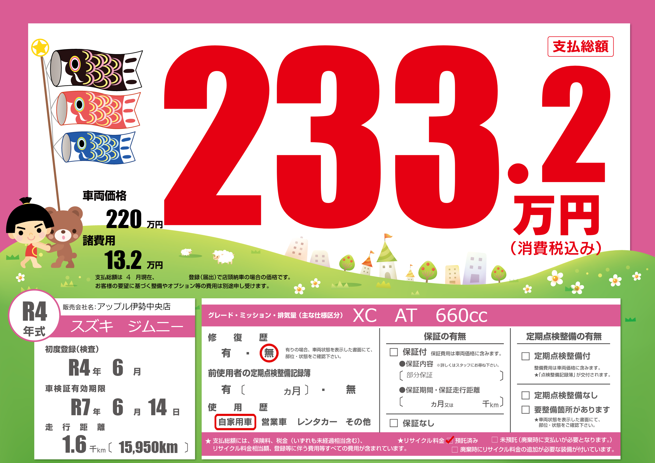 | 車名 | スズキ ジムニー | グレード ミッション 排気量 |