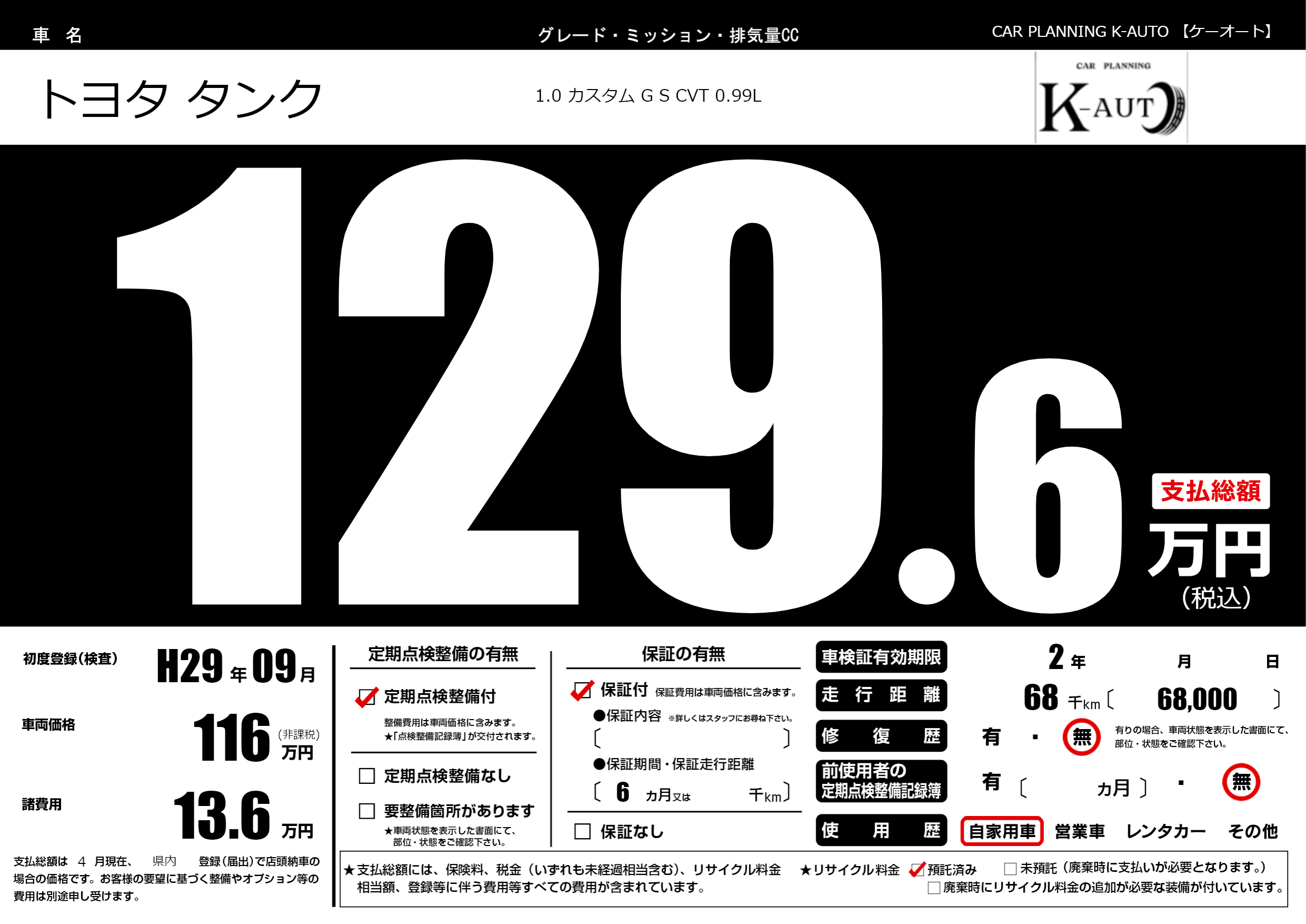 | 車名 | トヨタ タンク | グレード ミッション 排気量 |