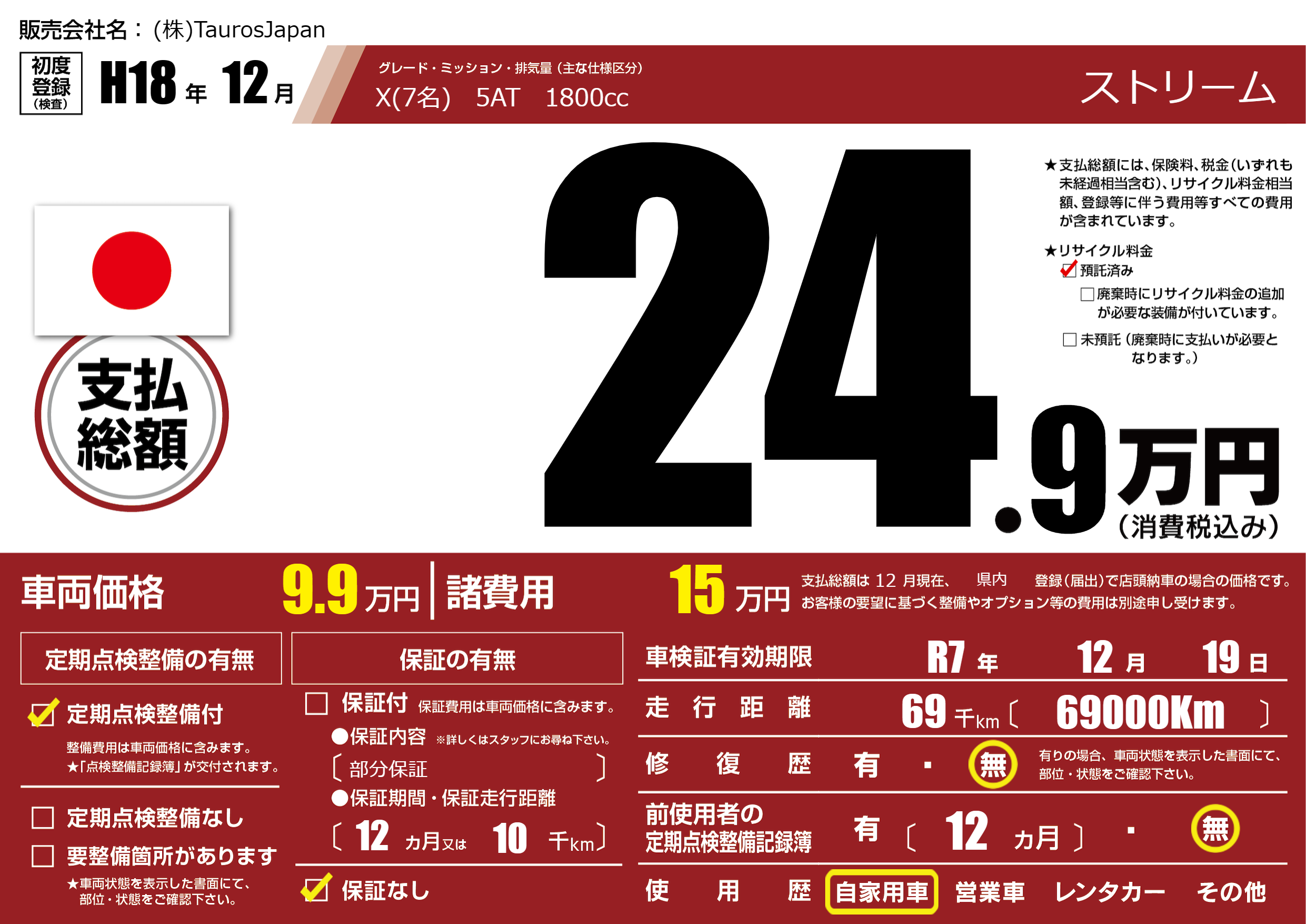 | 走行キロ | 6.9万km | 初年度登録 | H18年12月 |