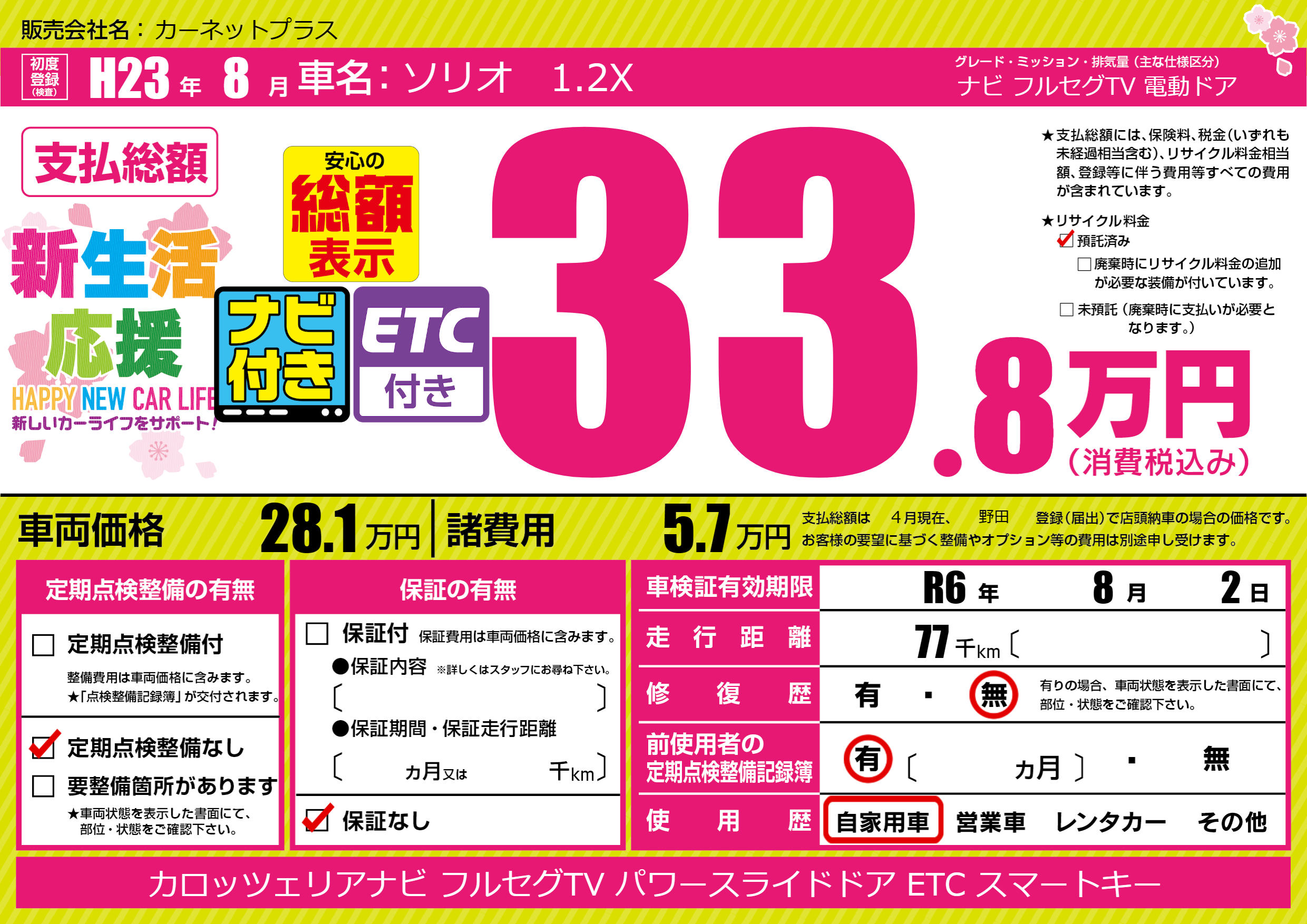 | 車名 | ソリオ 1.2X | グレード ミッション 排気量 |