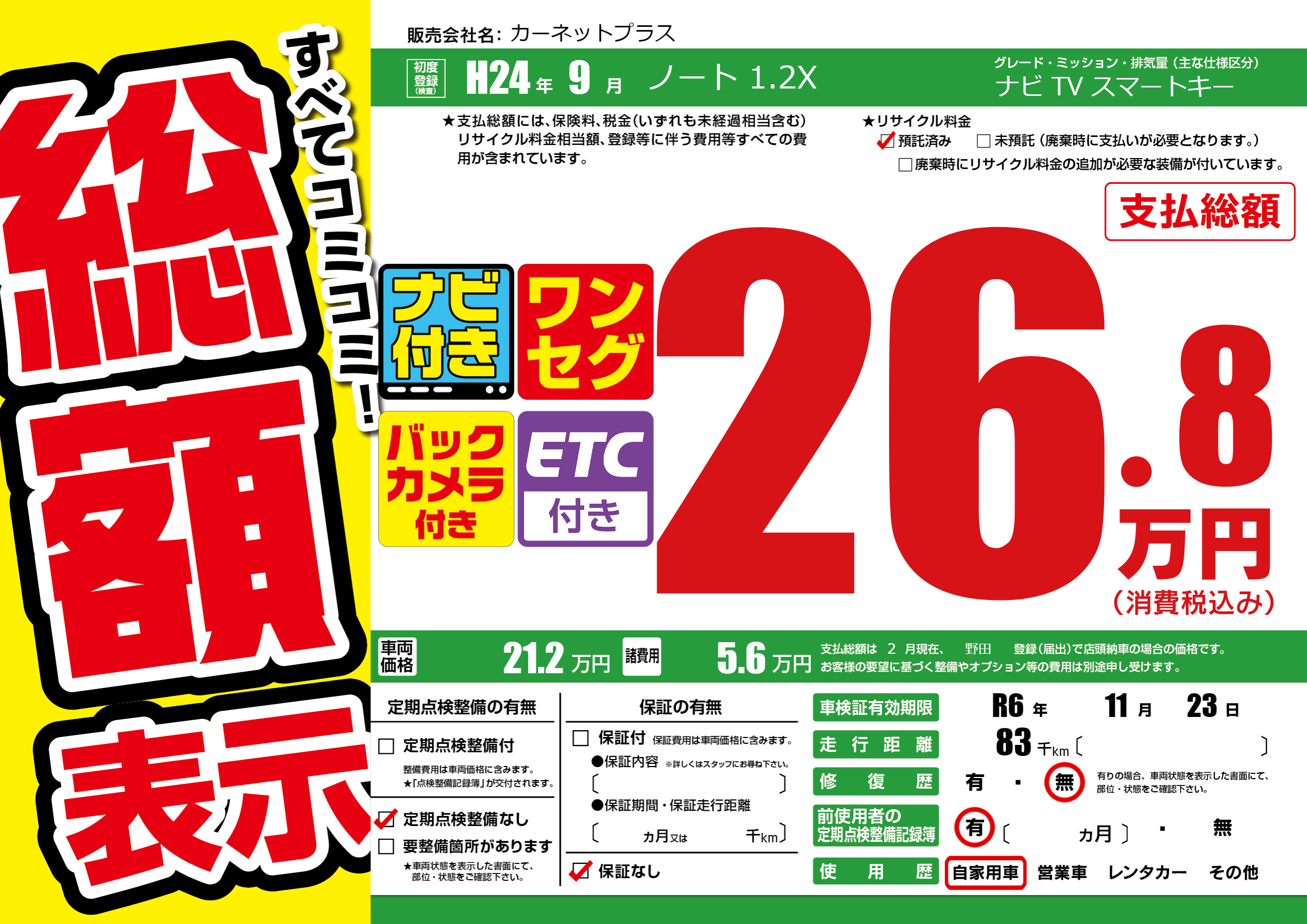 | 車名 | ノート 1.2X | グレード ミッション 排気量 |