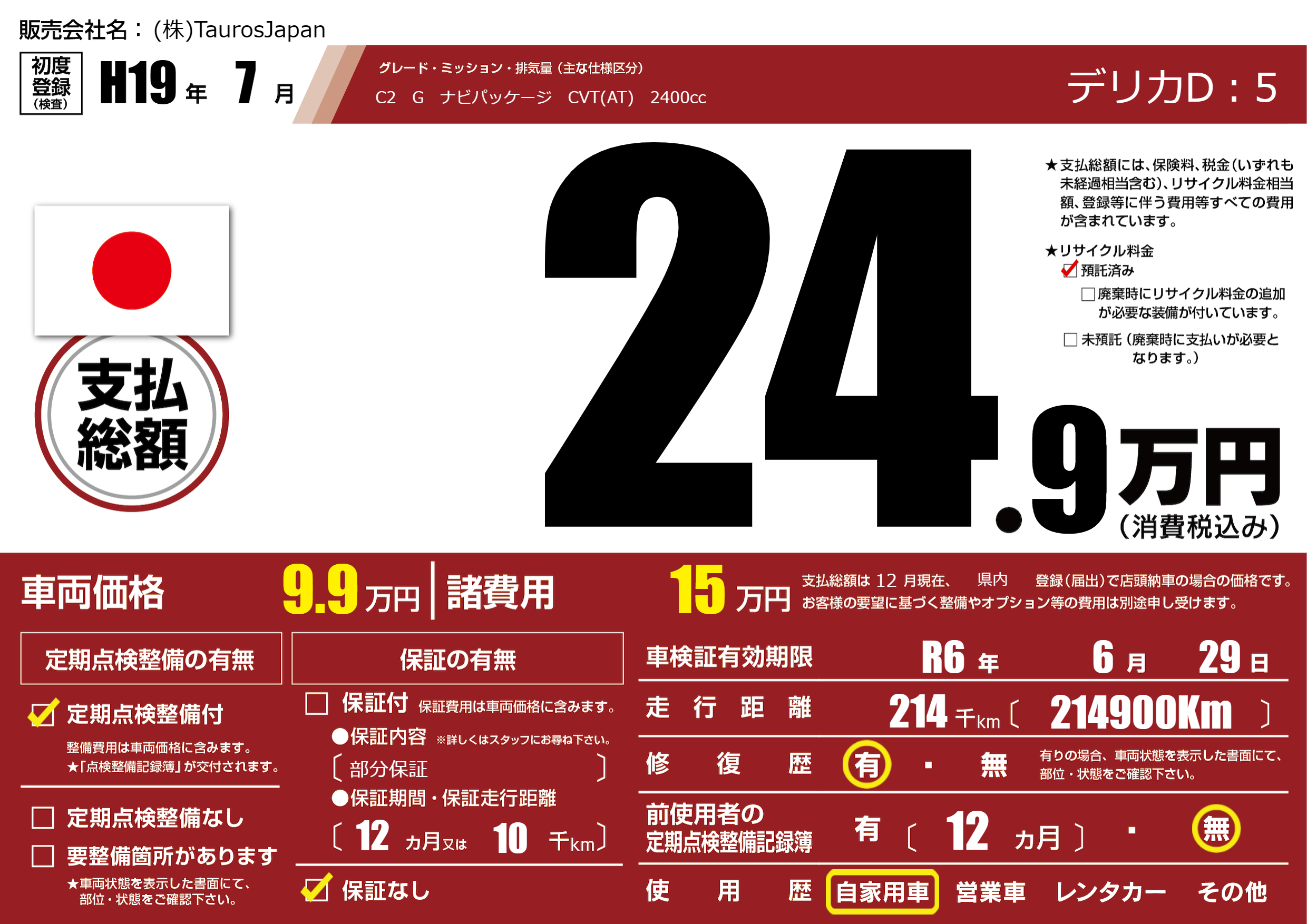 | 車名 | デリカD:5 | グレード ミッション 排気量 |