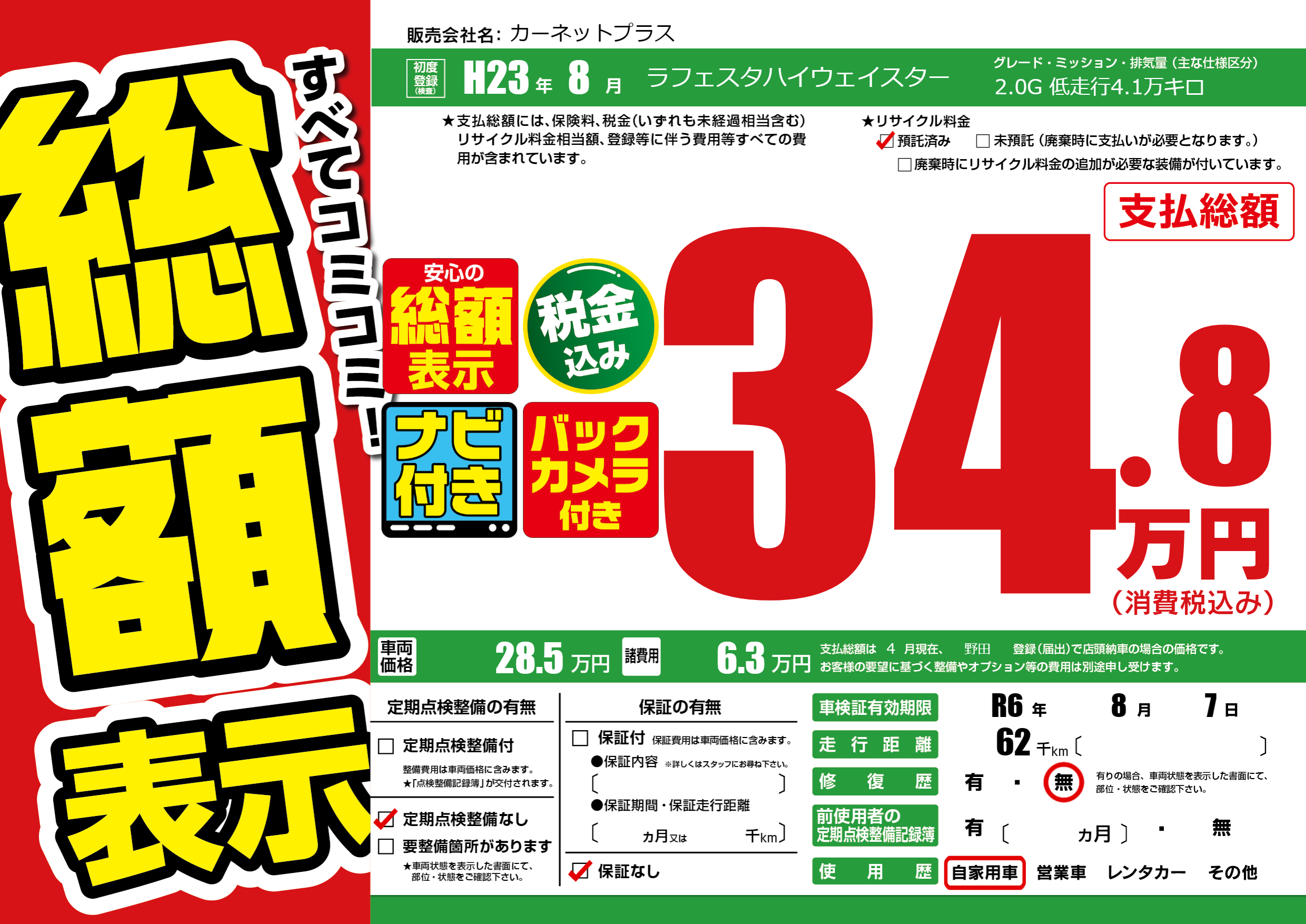 | 走行キロ | 6.2万km | 初年度登録 | H23年8月 |