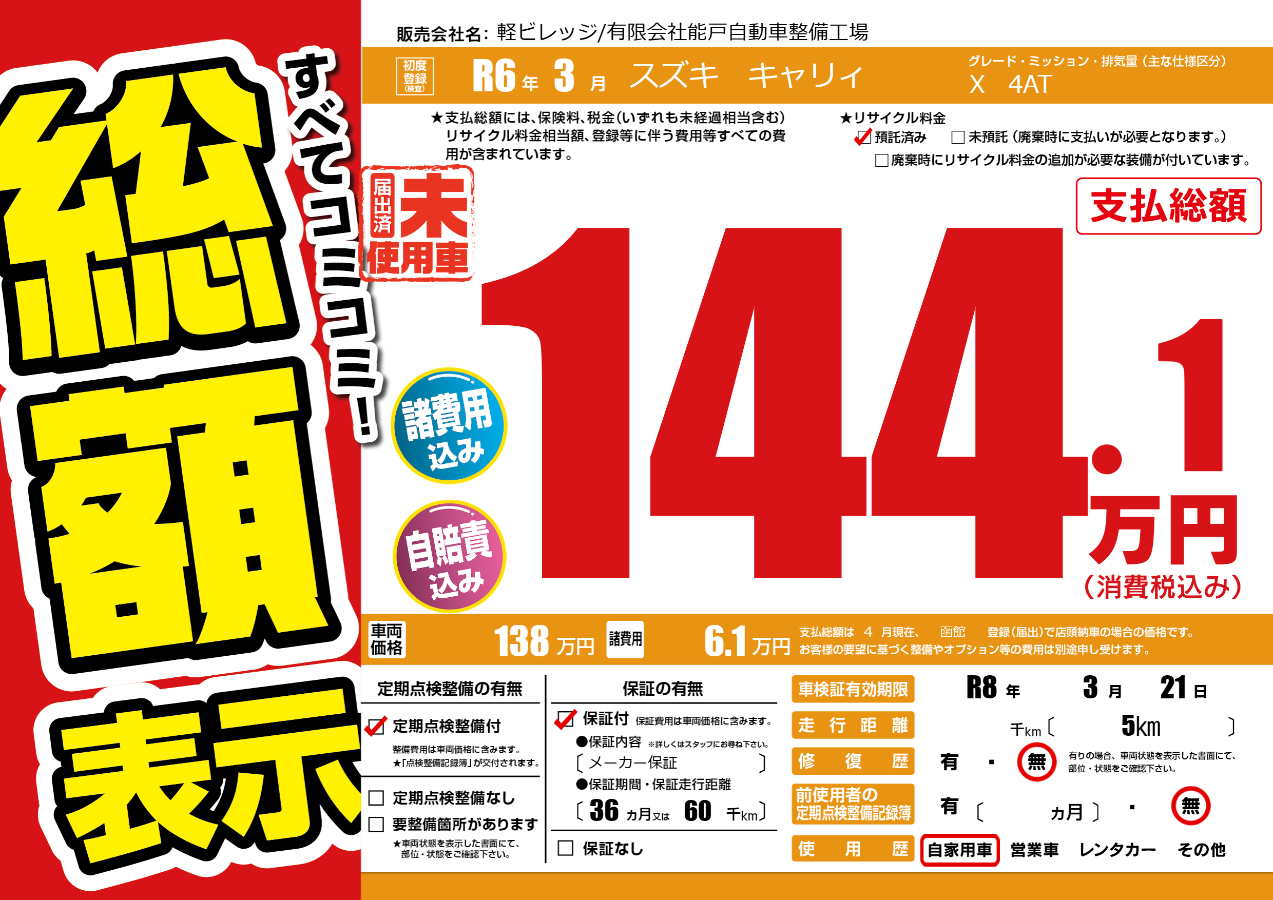 | 走行キロ | - | 初年度登録 | R6年3月 |