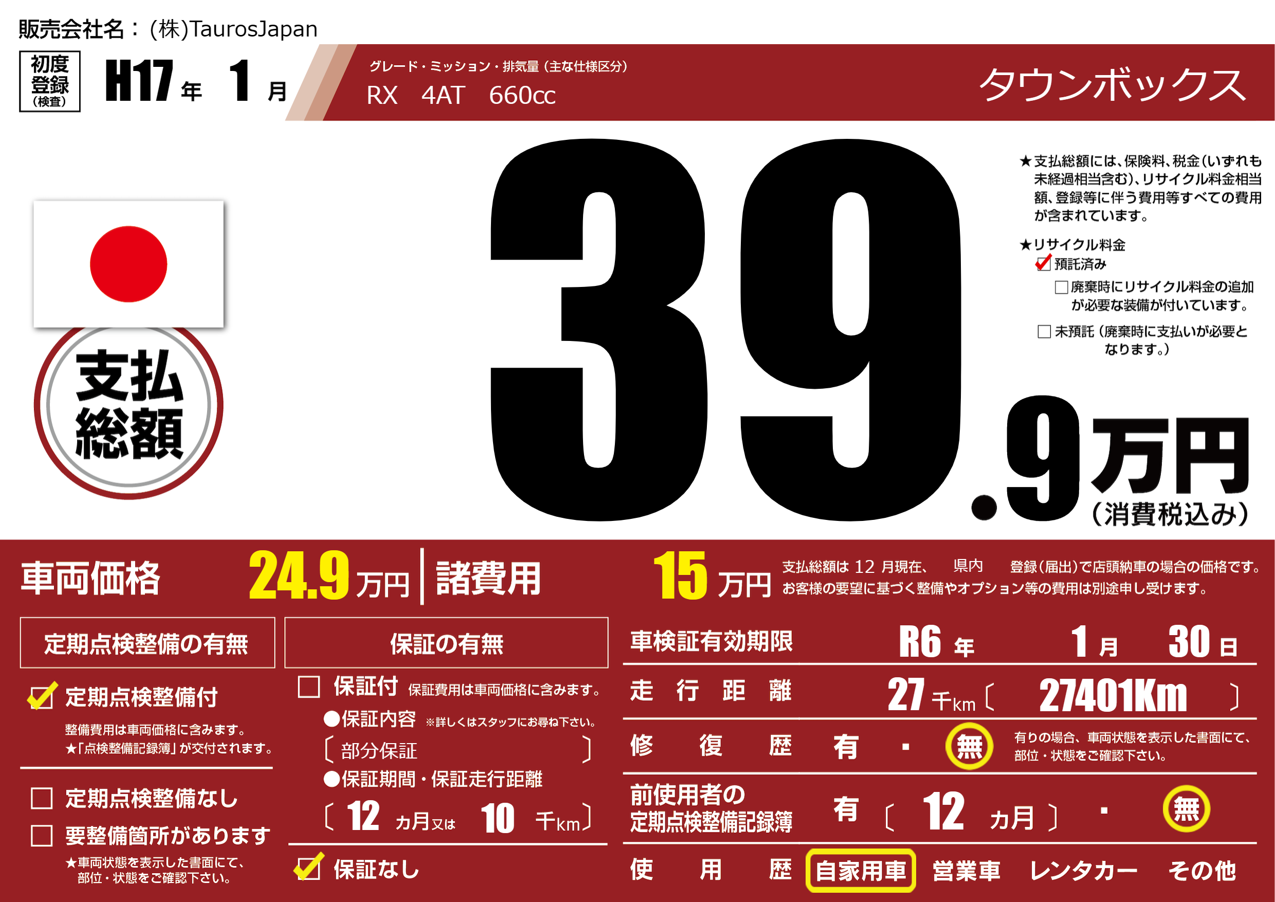 | 車名 | タウンボックス | グレード ミッション 排気量 |